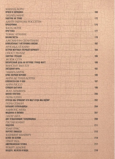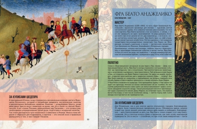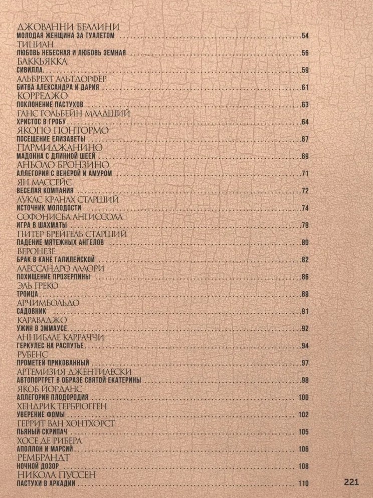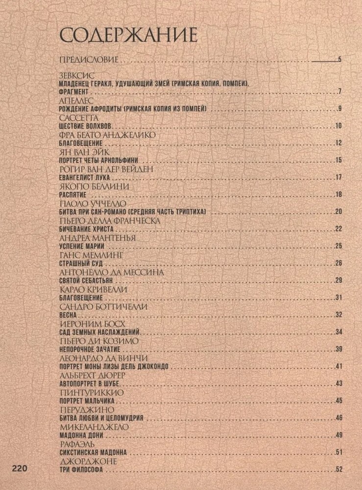 В издании представлены произведения мастеров, таких как Зевксис, Леонардо да Винчи, Рафаэль, Рембрандт, Караваджо и других. Каждая картина сопровождается кратким описанием и датировкой, что помогает познакомиться с историей искусства через призму выдающихся полотен.