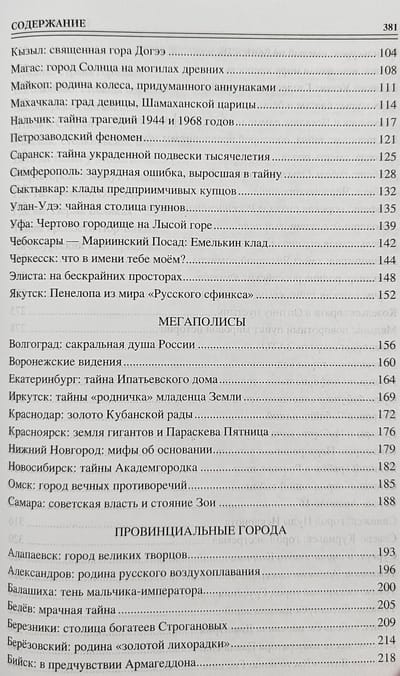 На сегодняшний день в России насчитывается 1125 городов. Есть среди них гигантские города-мегаполисы, есть и крохотные городки, у которых невозможно отнять этот добрый титул по причине их исторической значимости или ратного подвига жителей. Есть и совсем молодые, только-только народившиеся города-юноши, есть и древние седоголовые старцы, есть даже возвращенные из небытия мертвые города... Всех их объединила в одной книге загадка. У каждого города она своя: у кого тайна рождения, у кого загадки исторические, у иного - человеческие или сугубо природные, а у другого - мистические или даже инопланетные... Автор подбирал материал таким образом, чтобы книга как можно шире отразила многоликость, многонациональность великой России.