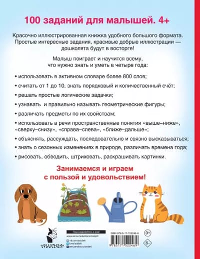 «100 заданий для малыша. 4+» — красочно иллюстрированная книжка удобного большого формата. Предложите ребёнку отгадывать загадки, сравнивать картинки в поисках отличий, проходить лабиринты, решать логические задачки — такие интеллектуальные занятия расширяют кругозор и словарный запас, формируют графические навыки, развивают мышление, память, внимание, наблюдательность и творческие способности. Вместе с главными героями — щенком и котёнком — занятия превратятся в увлекательную игру!