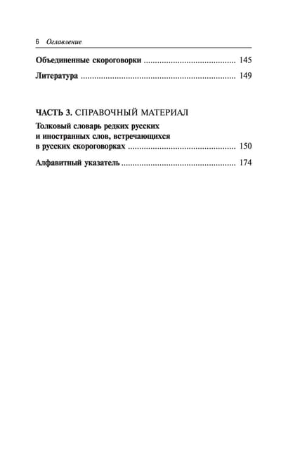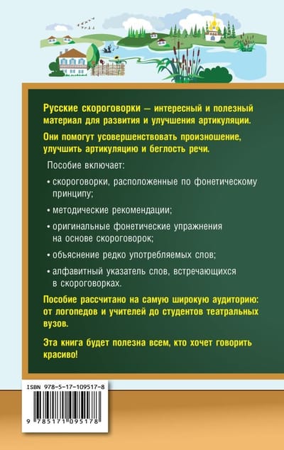 1 000 русских скороговорок расположены по фонетическому принципу. В книге использована удобная подборка скороговорок для отработки всех звуков. В начале книге — рекомендации по индивидуальной работе с ребенком, а также различные вариации упражнений для работы с детьми в группе. В конце книги — толковый словарь редких слов и алфавитный указатель слов, встречающихся в скороговорках. Книга рассчитана на широкую аудиторию: школьников; взрослых, страдающих нарушениями звукопроизношения; логопедов; воспитателей; родителей детей с нарушениями речи; преподавателей; всех, кто хочет усвоить правильное произношение звуков русского языка, избавиться от произносительных дефектов речи или улучшить свою дикцию. Ряд скороговорок прекрасно подойдет тамаде для использования на праздничных мероприятиях.