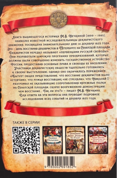 Книга выдающегося историка М.В. Нечкиной (1899–1985), наиболее известной исследовательницы декабристского движения, посвящена знаменательному дню 14 декабря 1825 года. Это – день восстания декабристов в Петербурге на Сенатской площади. Декабристов нередко называют «первенцами русской свободы». Они разработали широкую программу преобразований, которые должны были совершенно изменить государственное устройство России, предоставив основные права и свободы ее населению. Участники декабристских обществ тщательно готовились к своему выступлению, однако оно окончилось поражением. «Бытует общее представление, что восстание декабристов было «стоячим», что ружья восставших «не стреляли», что Николай I разгромил не оказывавшие сопротивления мятежные полки на Сенатской площади, скорее вооруженную демонстрацию, чем восстание... Так ли это?» – пишет М. В. Нечкина. Для ответа на эти вопросы она проводит подробное исследование всех событий 14 декабря 1825 года.