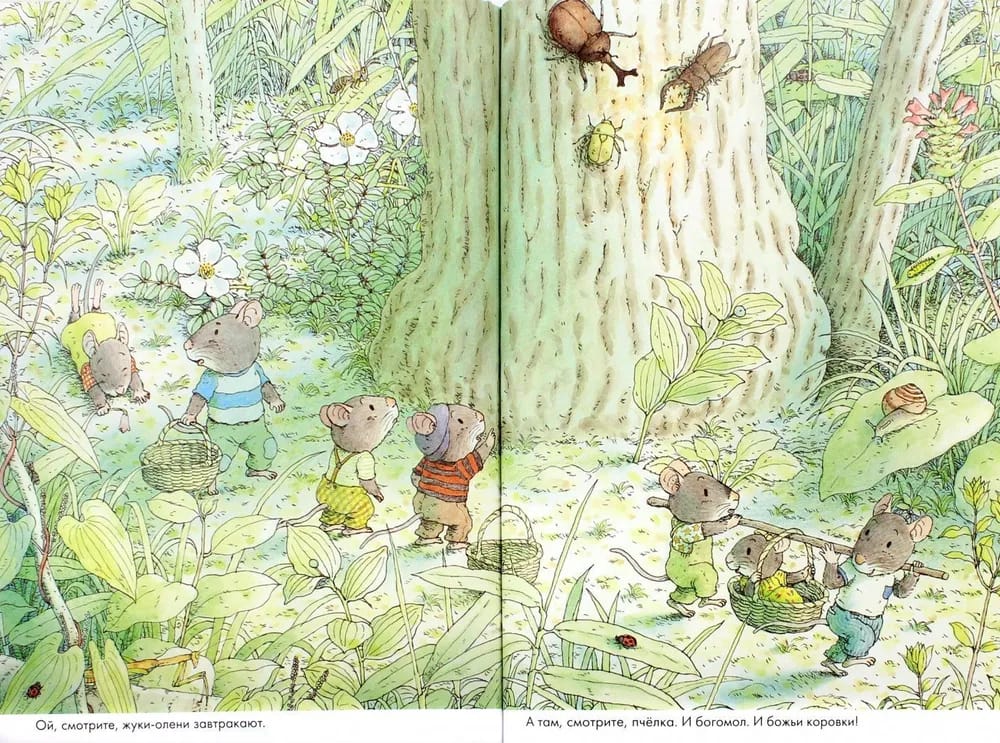 Это очень популярная в Японии (и не только) серия о красоте повседневности и о жизни трех поколений мышиного семейства: бабушка, дедушка, мама, папа и еще десяток мышат. Всего несколько слов - и тысячи деталей на каждой странице. Мыши живут в лесу, и вместе с ними мы видим мельчайшие подробности окружающего мира - росинки, травинки, красоту утренних лучей и осенних листьев.