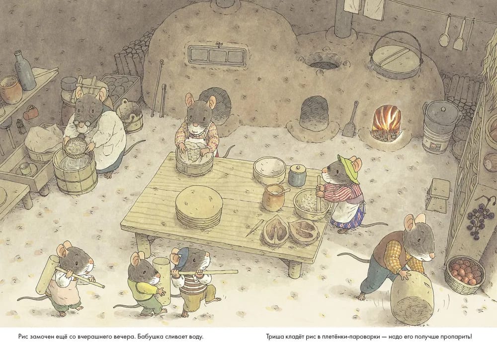 В каждой стране свои новогодние традиции. В книге «14 лесных мышей. Новый год» мышиное семейство готовит традиционное японское новогоднее блюдо — рисовые лепешки о-моти. Как любое праздничное блюдо, лепешки требуют усилий всех членов семьи — сделать тесто, развести огонь в специальных печурках, приготовить вкусные начинки! Чем больше постараться — тем вкуснее яства на новогоднем столе.