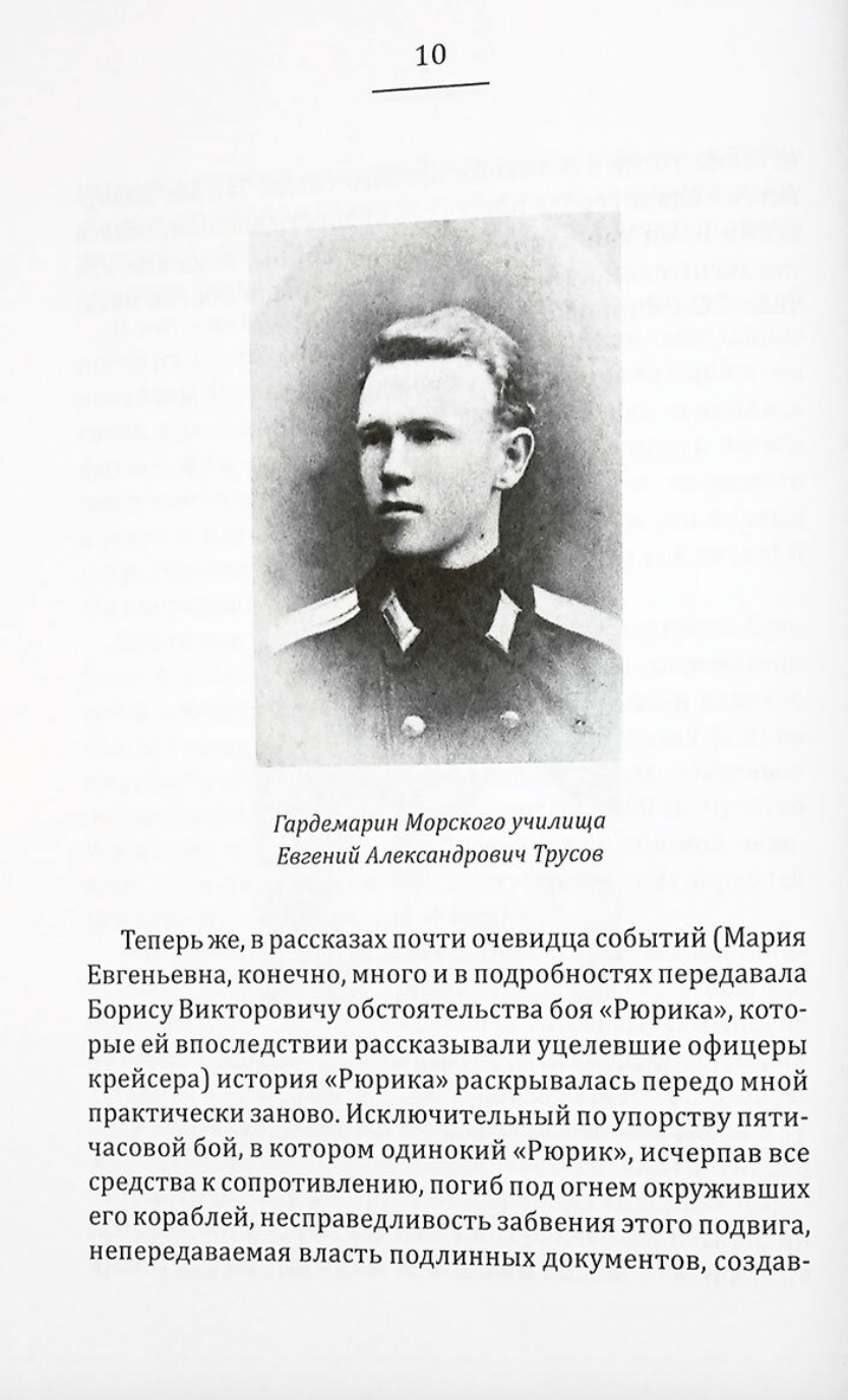 На наш взгляд, будет несправедливо говорить об одних и умалчивать про других, тем более что все они, и первые и вторые, исполнили свой долг до конца. Командир крейсера «Рюрик» капитан 1 ранга Евгений Александрович Трусов ушёл на дно Японского моря вместе с непобеждённым кораблём…