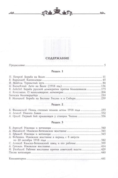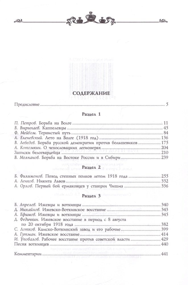 Боевые действия описываются на фоне политических акций Комуча, Уфимской Директории, Временного Сибирского правительства вплоть до вступления в верховное командование адмирала Колчака, то есть с мая по ноябрь 1918 г. Книга снабжена обширными и впервые публикуемыми комментариями, содержащими несколько сот неизвестных биографических справок об авторах и героях очерков.
