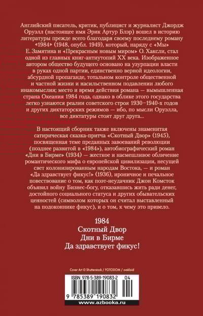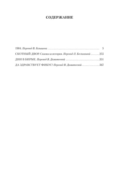 В настоящий сборник также включены знаменитая сатирическая сказка-притча «Скотный Двор» (1945), посвященная теме преданных завоеваний революции (позднее развитой в «1984»), автобиографический роман «Дни в Бирме» (1934) – жесткое и насмешливое обличение романтического мифа о европейской цивилизации, несущей свет колонизированным народам Востока, – и роман «Да здравствует фикус!» (1936), ироничное и печальное повествование о том, как поэт-неудачник Джон Комсток объявил войну Бизнес-богу, отказавшись жить ради денег, достойного социального статуса и других обывательских ценностей (символом которых он считал выставленный на подоконнике фикус), – и о том, к чему это привело.