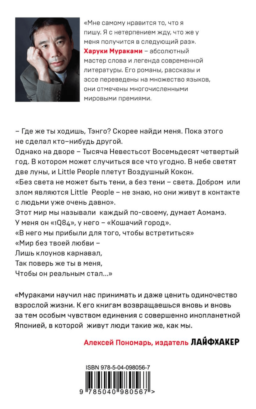 Главная литературная сенсация нового века, "магнум-опус прославленного мастера" и "обязательное чтение для любого, кто хочет разобраться в японской культуре наших дней", по выражению критиков. Действие книги происходит не столько в тысяча девятьсот восемьдесят четвертом году, сколько в тысяча невестьсот восемьдесят четвертом, в мире, где некоторые видят на небе две луны, где ключом к вечной любви служит Симфониетта Яначека, где полицейских после всколыхнувшей всю страну перестрелки с сектантами перевооружили автоматическими пистолетами взамен револьверов, где LittlePeople — Маленький Народец — выходят изо рта мертвой козы и плетут Воздушный Кокон.