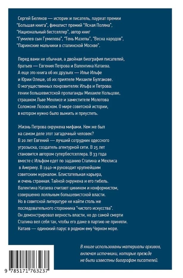 Жизнь Петрова окружена мифами. Кем же был на самом деле этот загадочный человек? В 20 лет Евгений — лучший сотрудник одесского угрозыска, создатель агентурной сети. В 25 лет становится автором супербестселлера. В 33 года вместе с Ильфом едет по заданию Сталина и Мехлиса в Америку. В 1940-м руководит крупнейшим советским журналом. Блистательная карьера, и очень странная. Тайной окружена и его гибель.