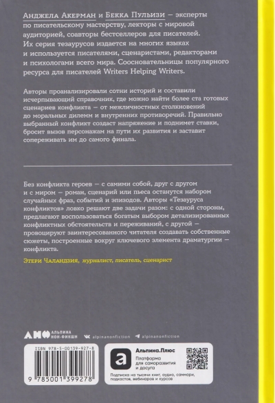 Конфликт — двигатель любой истории. Но как придумать оригинальное и захватывающее противостояние, которое раскроет характер героя и будет держать читателя и зрителя в напряжении до последней страницы? «Тезаурус конфликтов» — уникальное руководство для писателей и сценаристов, которое поможет создавать по-настоящему глубокие и многогранные сюжеты. Эксперты по писательскому мастерству Анджела Акерман и Бекка Пульизи проанализировали сотни историй и составили исчерпывающий справочник, в котором можно найти более ста готовых сценариев конфликта — от межличностных столкновений до моральных дилемм и внутренних противоречий. Правильно выбранный конфликт создаст напряжение и поднимет ставки, бросит вызов персонажам на пути их развития и заставит сопереживать им до самого финала.