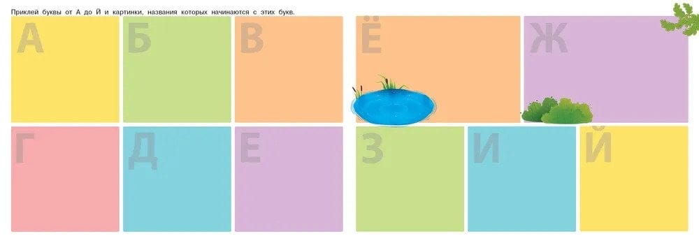 С этой книжкой вы легко выучите все буквы. Приклейте на страничку букву, найдите картинки, названия которых начинаются с этой буквы и приклейте рядом. Наклеек так много, что их можно клеить не только на страницы книжки. Заведите тетрадку, в которую будете клеить картинки и тренироваться писать буквы. Или украсьте наклейками всё, что захочется.