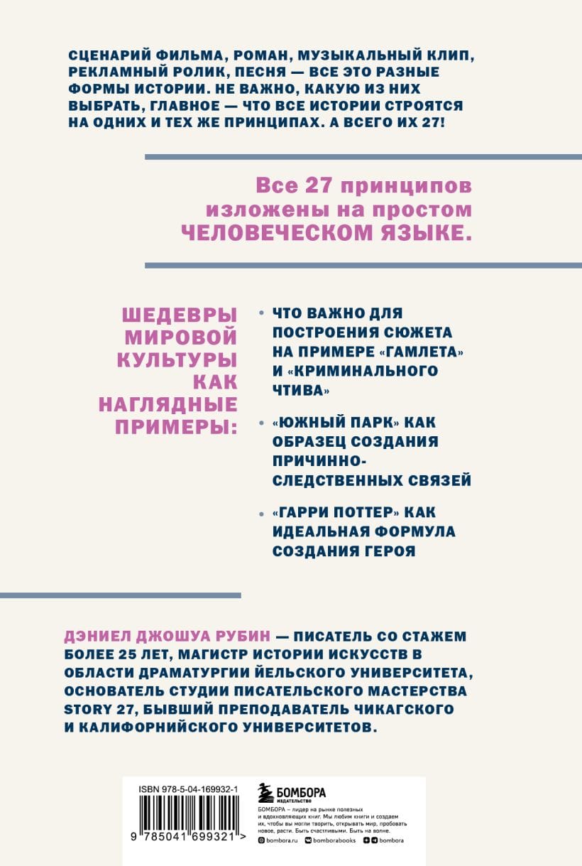 В своей книге Дэниэл Джошуа Рубин разбирает каждый принцип отдельно на живых примерах. Он объясняет, как строится сюжет «Гамлета» и «Криминального чтива», рассказывает секреты создания портрета героя, анализируя «Гарри Поттера», и на примере «Южного парка» учит строить причинно-следственные связи.