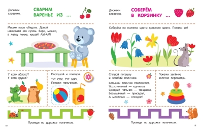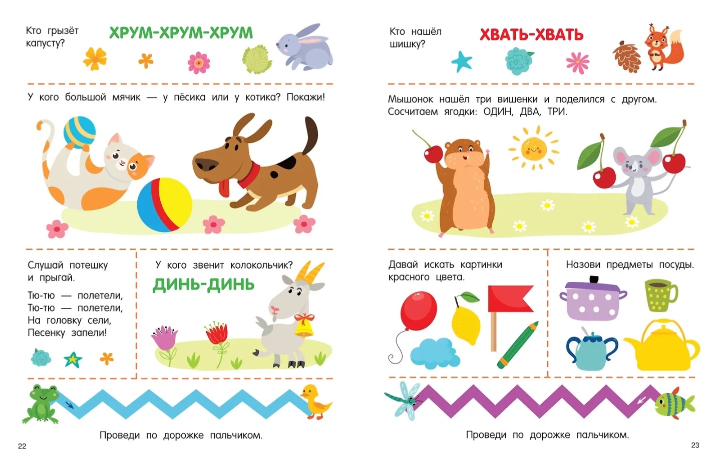 Прекрасно иллюстрированная книжка для самых маленьких + 30 наклеек разного размера. Весёлые игры с картинками, песенки, потешки, первые раскраски, шагалки, стихи-болтушки, гимнастика для пальчиков — всё, что нужно для развития речи, мышления и эмоционального интеллекта, зрительного восприятия, мелкой моторики. На красочных страницах — интересные игровые сюжеты, которые помогут увлечь ребёнка. Бонус — крупные наклейки с хорошей печатью, легко отделяются от основы, прекрасно подойдут для детских пальчиков.