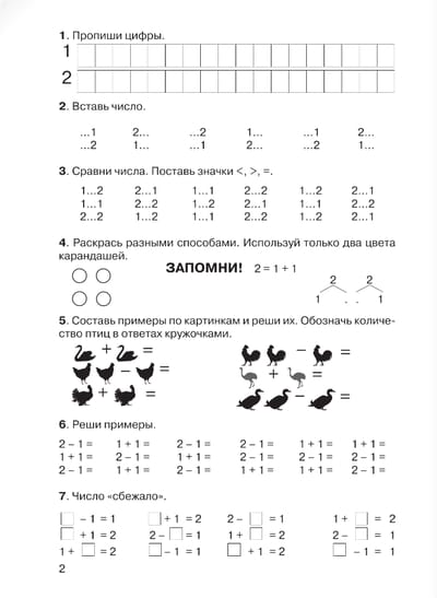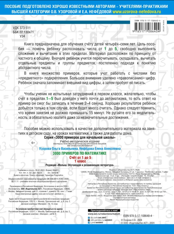 Книга предназначена для обучения счёту детей четырёх-семи лет. Цель пособия - помочь ребёнку распознать числа от 1 до 5, свободно выполнять сложение и вычитание в этих пределах. Вначале ребёнок учится пересчитывать, складывать, вычитать отдельные предметы и группы предметов, постепенно подходя к понятию абстрактного числа.