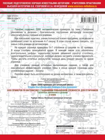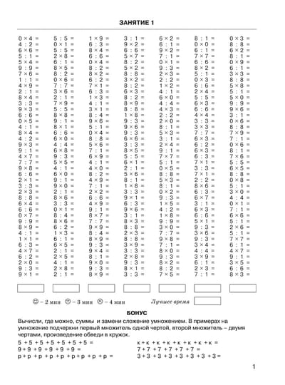 На каждой странице приведены 5-7 столбиков в среднем по 52 примера. В конце столбика записывается время. В нижнем левом углу обозначены контрольные цифры: идеальное время решения одного столбика, удовлетворительное и результатов, каждый день следует решать по одной странице.