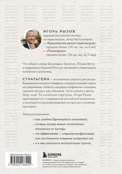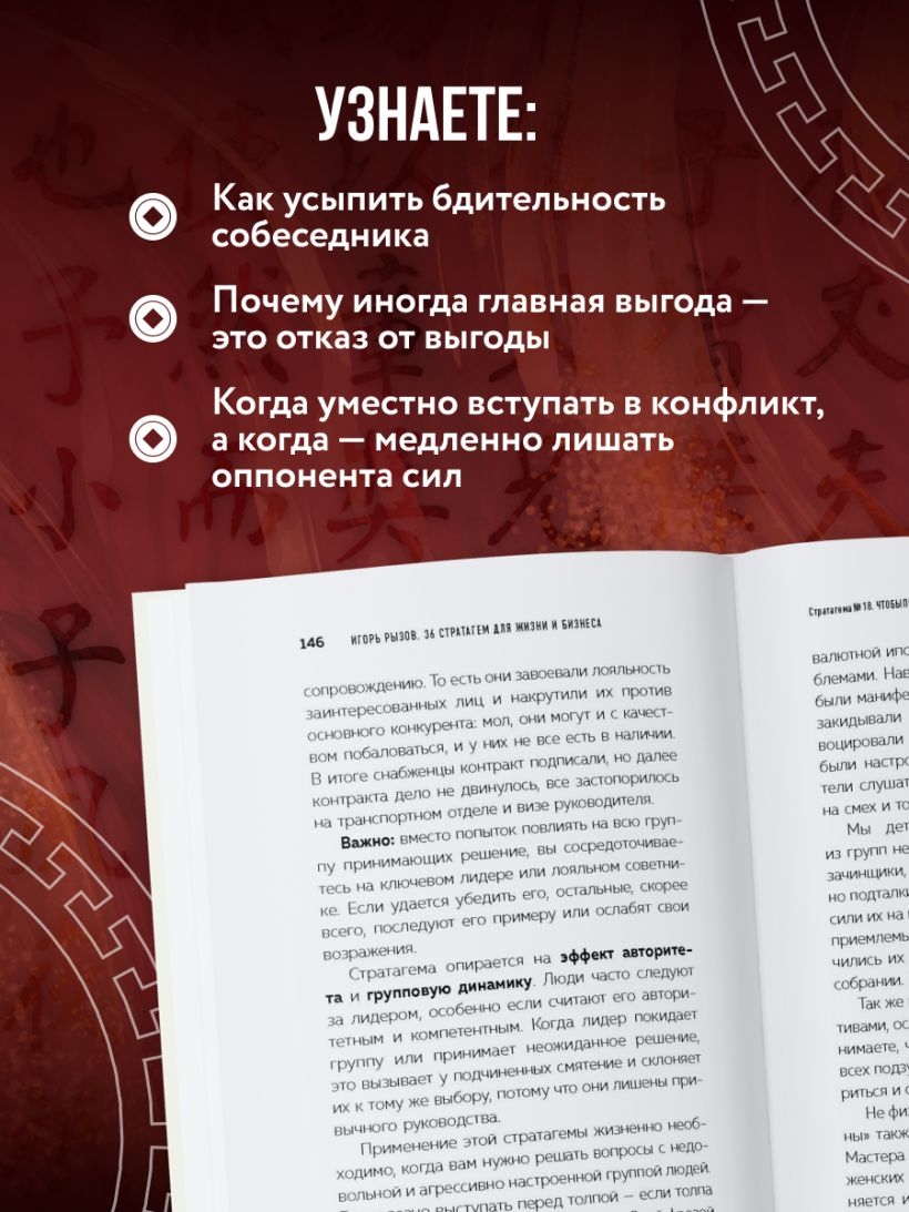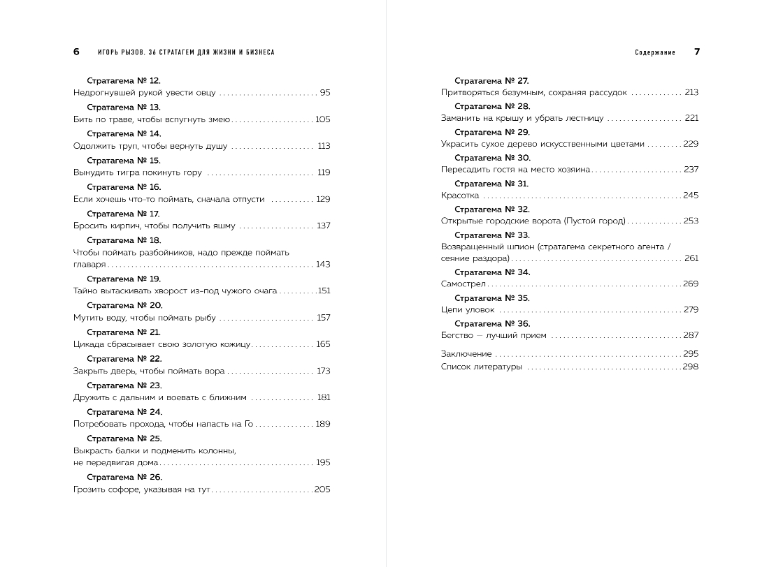 Стратагема — это военная хитрость для жизни. Выверенный алгоритм поведения, который позволяет играть на опережение, избегать ненужных конфликтов и находить скрытые ресурсы как в бизнесе, так и в жизни в целом. Мир знает 36 китайских стратагем. Российский эксперт по переговорам Игорь Рызов адаптировал их к современной реальности и многократно проиллюстрировал на простых и понятных примерах.