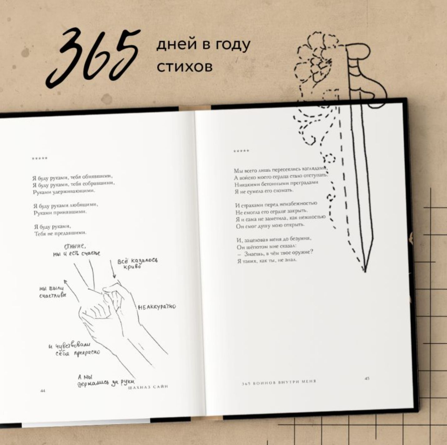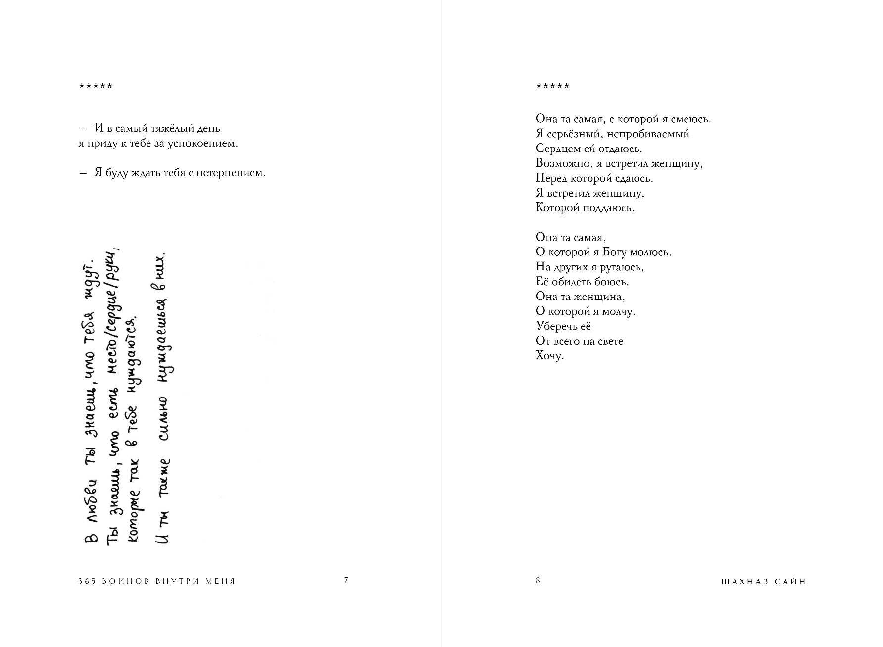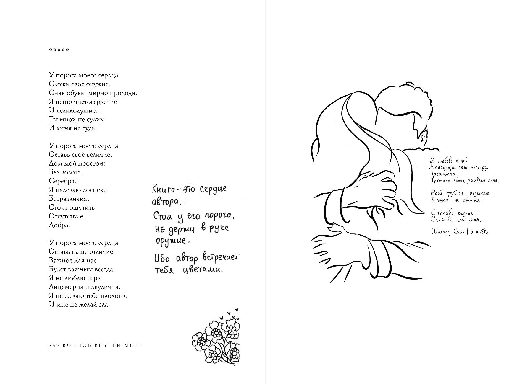 «365 воинов внутри меня» — это сборник молодой поэтессы Шахназ Сайн. Она начала опубликовать свои истории с 19 лет, собрав первую маленькую аудиторию. Позже ее узнали как автора тонких лирических романов «Таха», «На периферии», «Дороже вдоха», серии историй «Раз и Навсегда...», а ее стихи легли в основу многих песен, в том числе Миши Марвина.