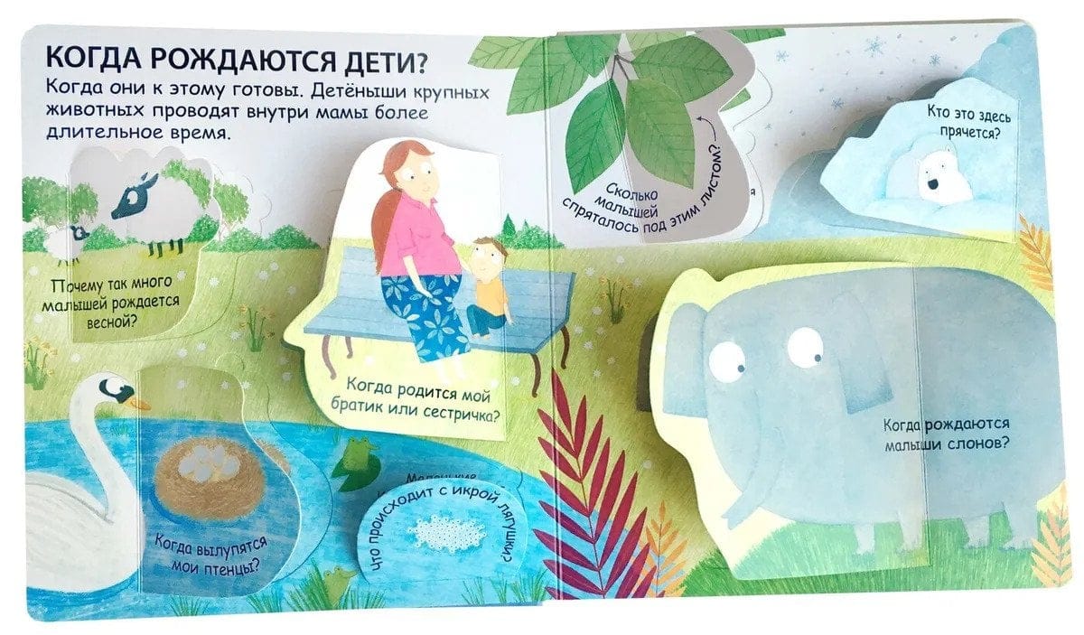 Как малыш попадает в мамин животик? Кто спрятался в сумке мамы-кенгуру и когда рождаются малыши слонов? Книга ответит на самые интересные вопросы о том, как появляются дети у людей, животных, птиц и рыб!  Что внутри? - более 40 окошек; - крупные иллюстрации; - ответы под окошками на самые интересные вопросы о том, откуда берутся дети.  Содержание: Откуда берутся дети? Как появляются дети? Когда рождаются дети? Что нужно младенцам? Как растут дети? Кем я буду?   Важно знать родителям: Книга рекомендована для детей в возрасте от 3-х лет, но в качестве демонстративного материала подходит с 2-х лет.