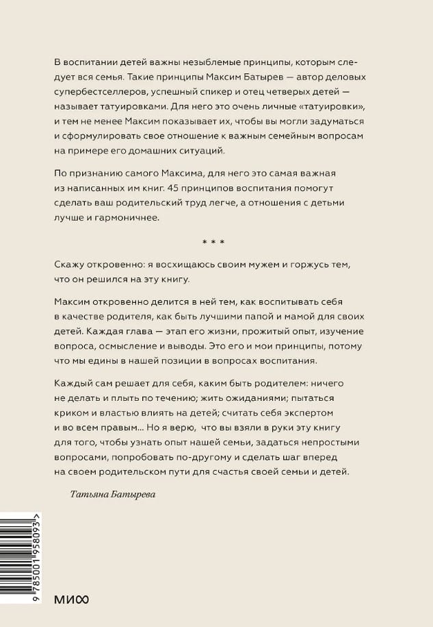 Долгожданная новинка о родительских татуировках Максима Батырева - отца четверых детей, автора супербестселлеров и популярного спикера.  В воспитании детей важны незыблемые принципы, которым следует вся семья. Такие принципы Максим Батырев называет татуировками. Это очень личные «татуировки», но Максим решился показать их, чтобы вы могли задуматься и сформулировать свое отношение к важным семейным вопросам.