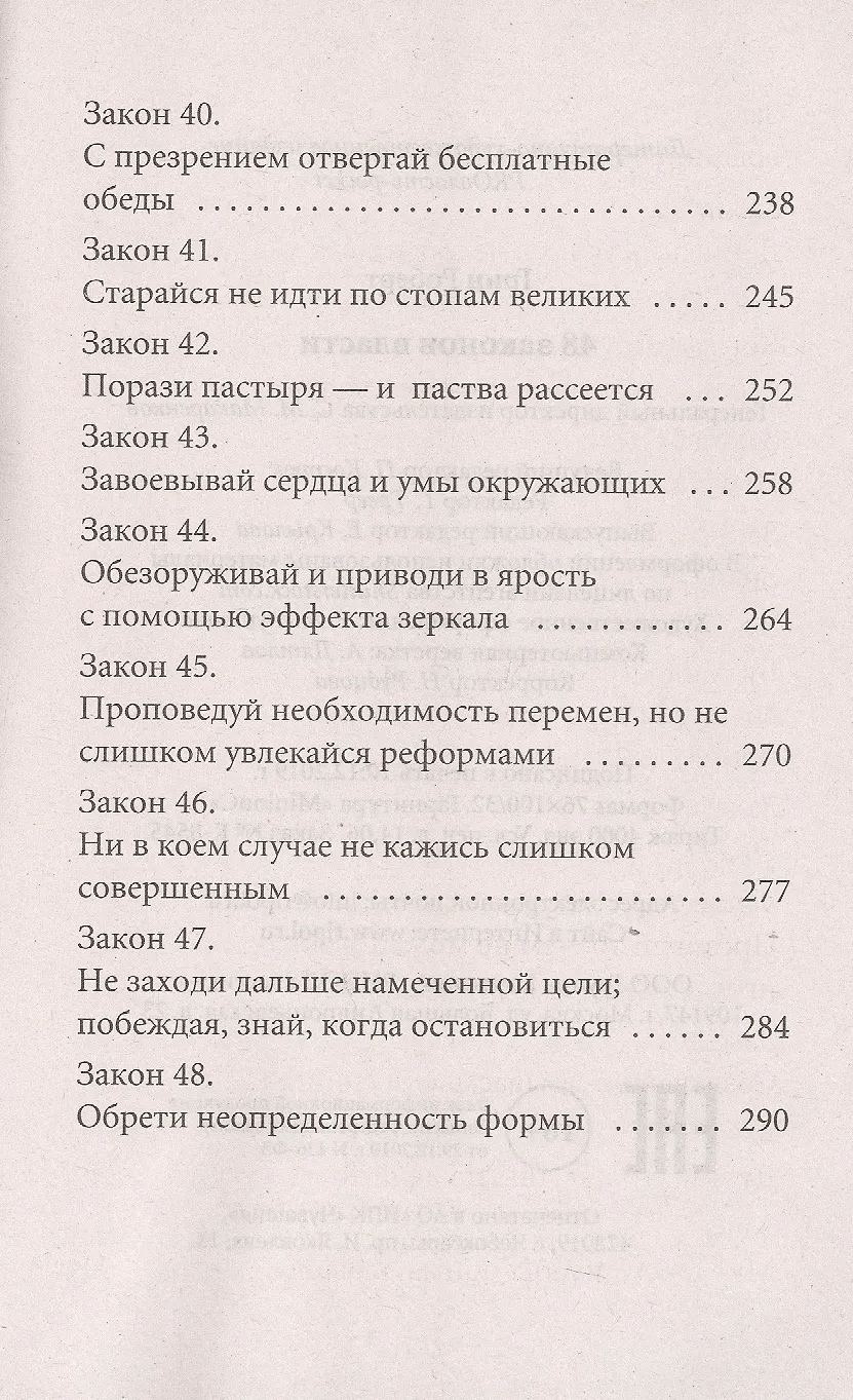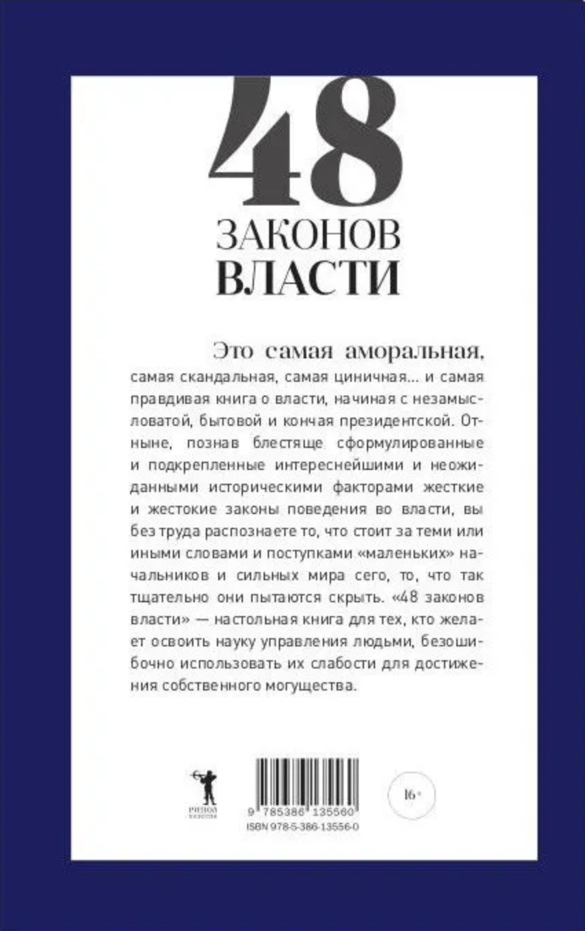 Это самая аморальная, самая скандальная, самая циничная. и самая правдивая книга о власти, начиная с незамысловатой, бытовой и кончая президентской. Отныне, познав блестяще сформулированные и подкрепленные интереснейшими и неожиданными историческими факторами жесткие и жестокие законы поведения во власти, вы без труда распознаете то, что стоит за теми или иными словами и поступками «маленьких» начальников и сильных мира сего, то, что так тщательно они пытаются скрыть. «48 законов власти» - настольная книга для тех, кто желает освоить науку управления людьми, безошибочно использовать их слабости для достижения собственного могущества.