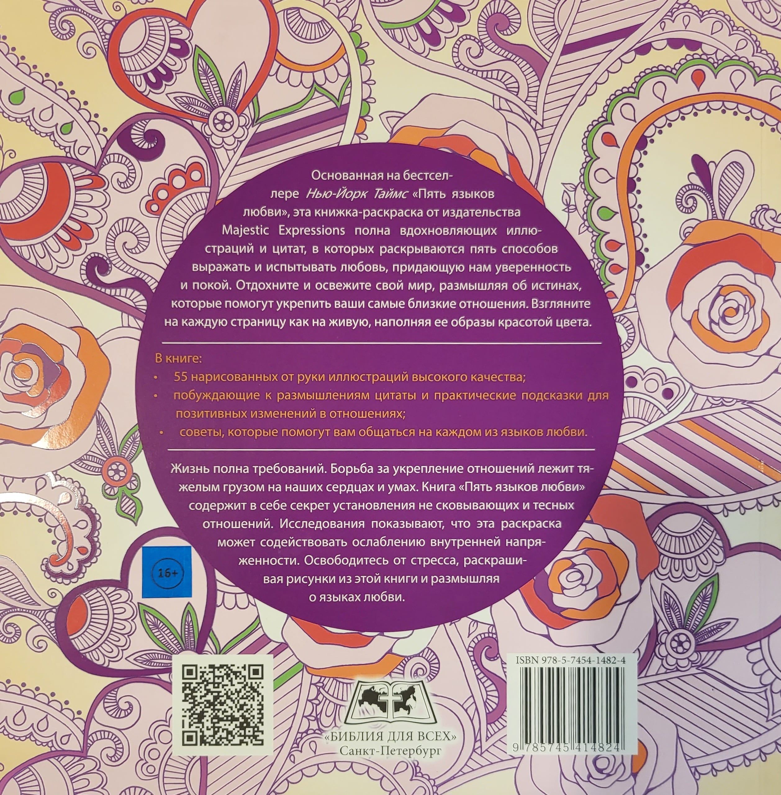 Основанная на бестселлере Нью-Йорк Таймс «Пять языков любви», эта книжка-раскраска от издательства Majestic Expressions полна вдохновляющих иллюстраций и цитат, в которых раскрываются пять способов выражать и испытывать любовь, придающую нам уверенность и покой. Отдохните и освежите свой мир, размышляя об истинах, которые помогут укрепить ваши самые близкие отношения. Взгляните на каждую страницу как на живую, наполняя ее образы красотой цвета. В книге: 55 нарисованных от руки иллюстраций высокого качества; побуждающие к размышлениям цитаты и практические подсказки для позитивных изменений в отношениях; советы, которые помогут вам общаться на каждом из языков любви. Жизнь полна требований. Борьба за укрепление отношений лежит тяжелым грузом на наших сердцах и умах. Книга «Пять языков любви» содержит в себе секрет установления не сковывающих и тесных отношений. Исследования показывают, что эта раскраска может содействовать ослаблению внутренней напряженности. Освободитесь от стресса, раскрашивая рисунки из этой книги и размышляя о языках любви.