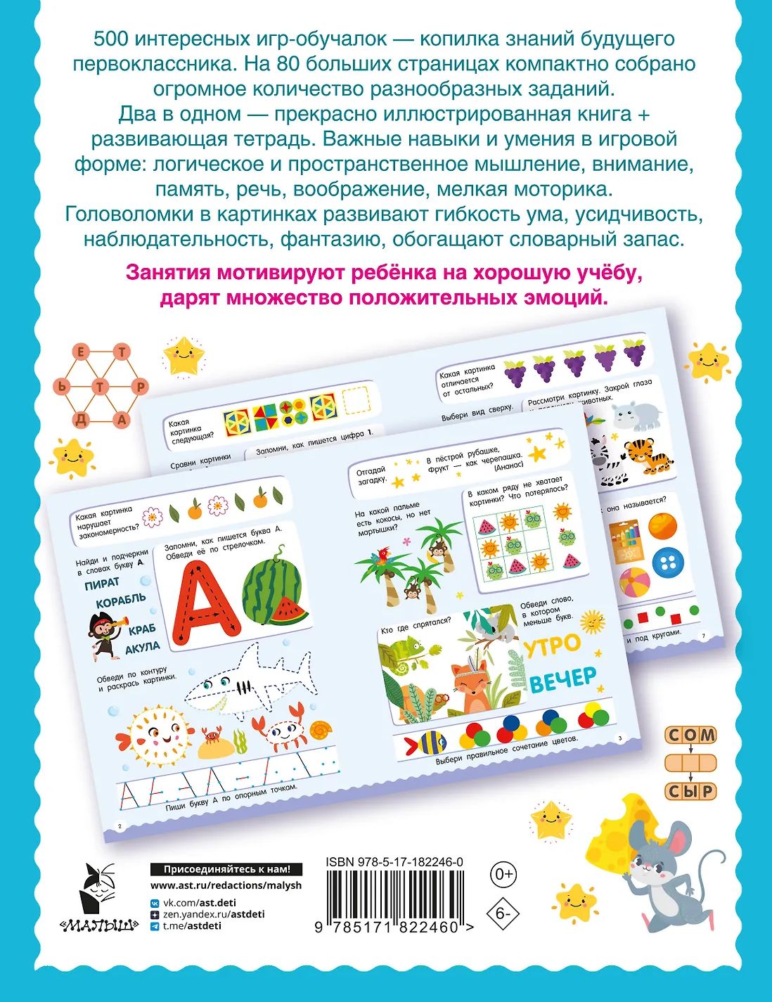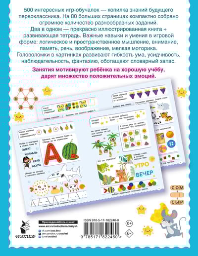 Как организовать подготовку к школе для своего ребёнка? Решение есть — никаких скучных упражнений, только игры с буквами и числами, головоломки, сравнилки, дорисовашки, ребусы и загадки, бродилки и лабиринты, скороговорки, задачки на логику и сообразительность. Занятия по развивающей книге «500 увлекательных заданий для подготовки к школе. 6–7 лет» помогут подготовить ребёнка к обучению в первом классе и к овладению полезными навыками: он познакомится с алфавитом и потренируется считать от 1 до 10, научится контролировать пишущую руку, сможет красиво и аккуратно обводить геометрические фигуры, писать печатные буквы и цифры по опорным точкам, разовьёт внимание и зрительно-пространственную ориентацию, а также саморегуляцию и контроль, что важно для формирования произвольного внимания и усидчивости.