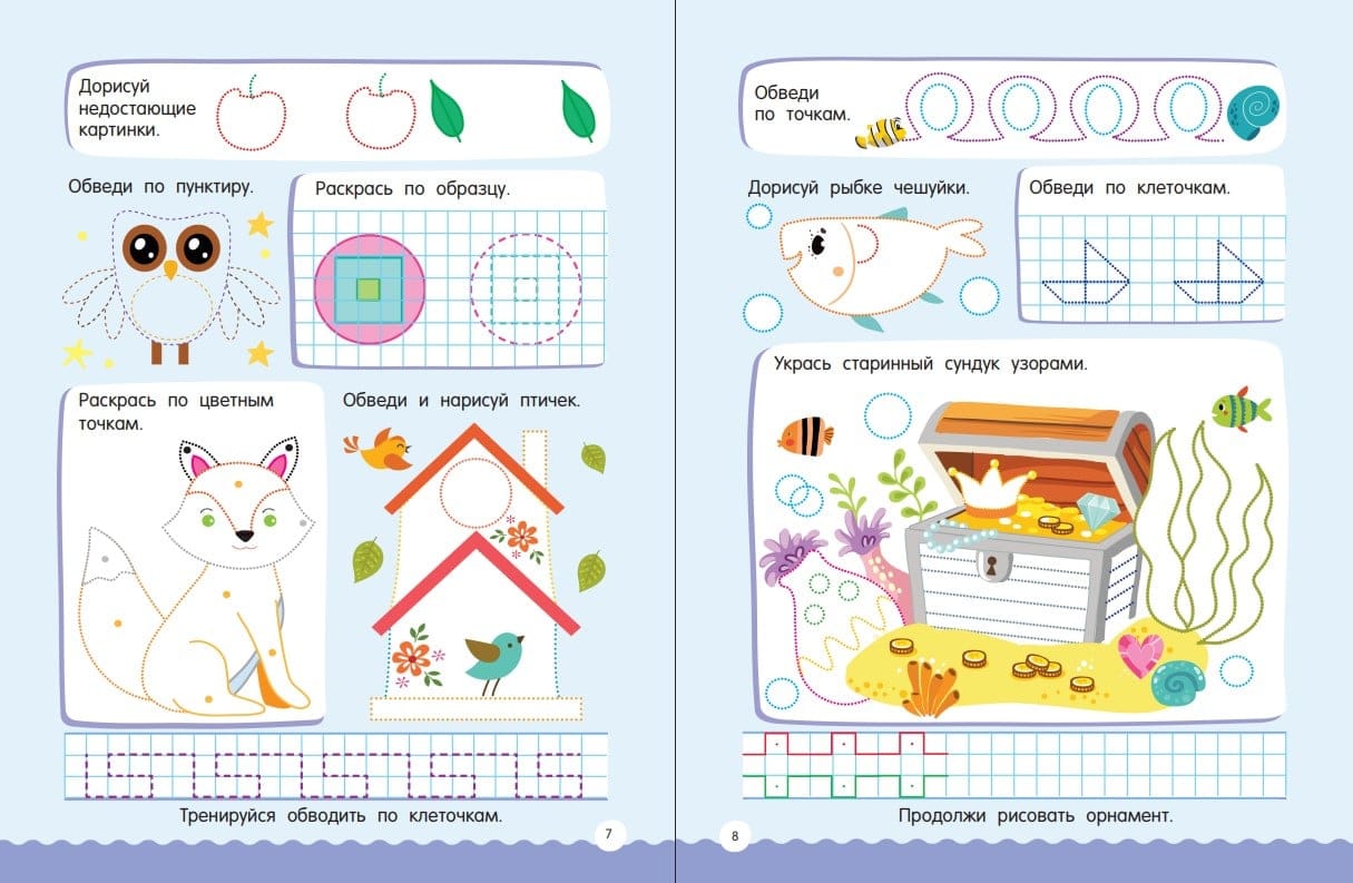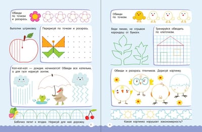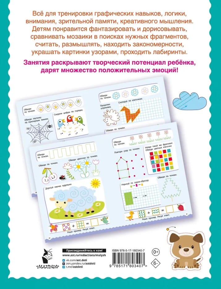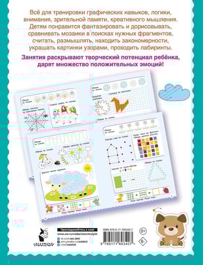 Много-много графических головоломок, раскрасок, игр с цифрами, находилок, задачек на логику и сообразительность. Предложите весёлой компании фантазировать и дорисовывать, сравнивать мозаики в поисках нужных фрагментов, считать, размышлять, находить закономерности, копировать по клеточкам и точкам, украшать картинки узорами, проходить лабиринты — такие интеллектуальные занятия расширяют кругозор и словарный запас, формируют графические навыки, развивают мышление, память, внимание, наблюдательность, смекалку и творческие способности. Ребёнок откроет первую страницу — и уже не сможет оторваться!