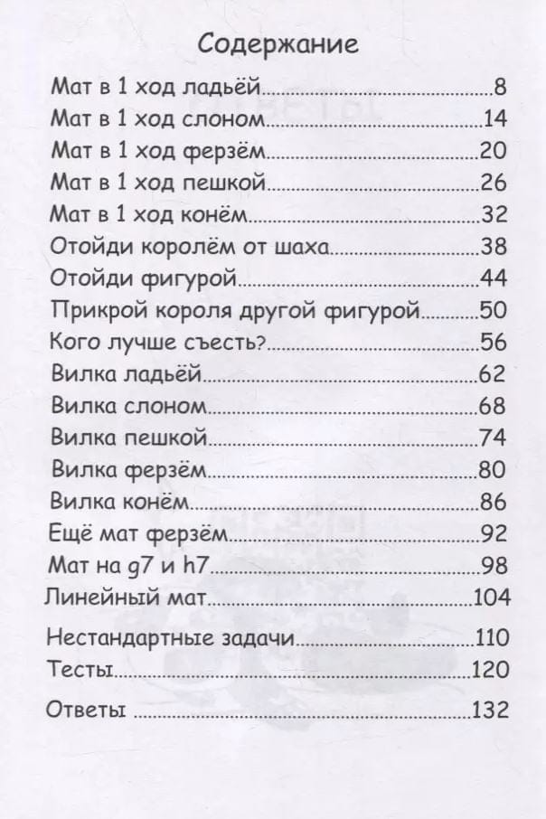 Книга рассчитана на начинающих шахматистов. В ней собрано более 500 простых задач, решаемых за один ход, в которых нужно, например, поставить мат, сделать вилку или защититься.