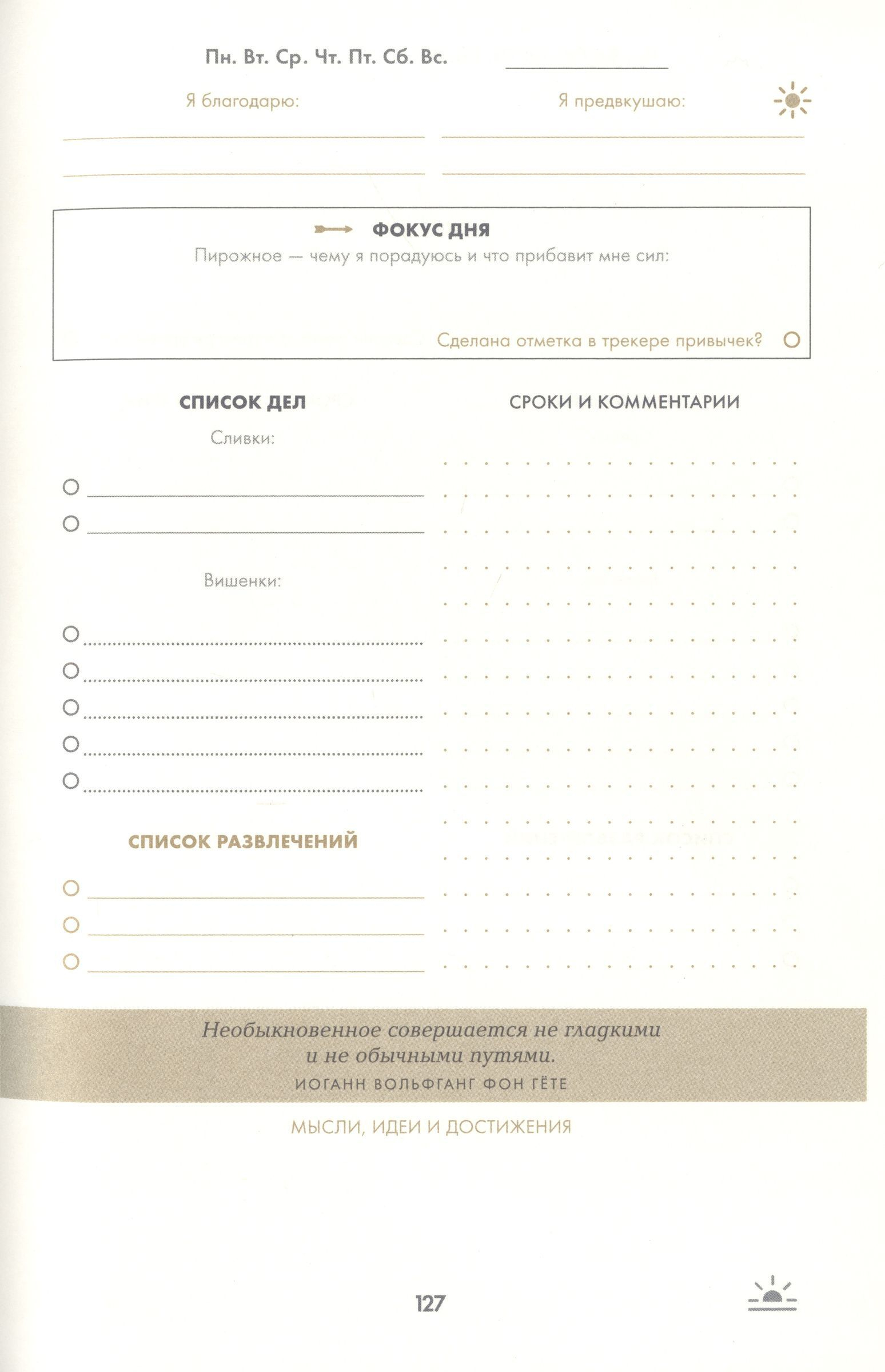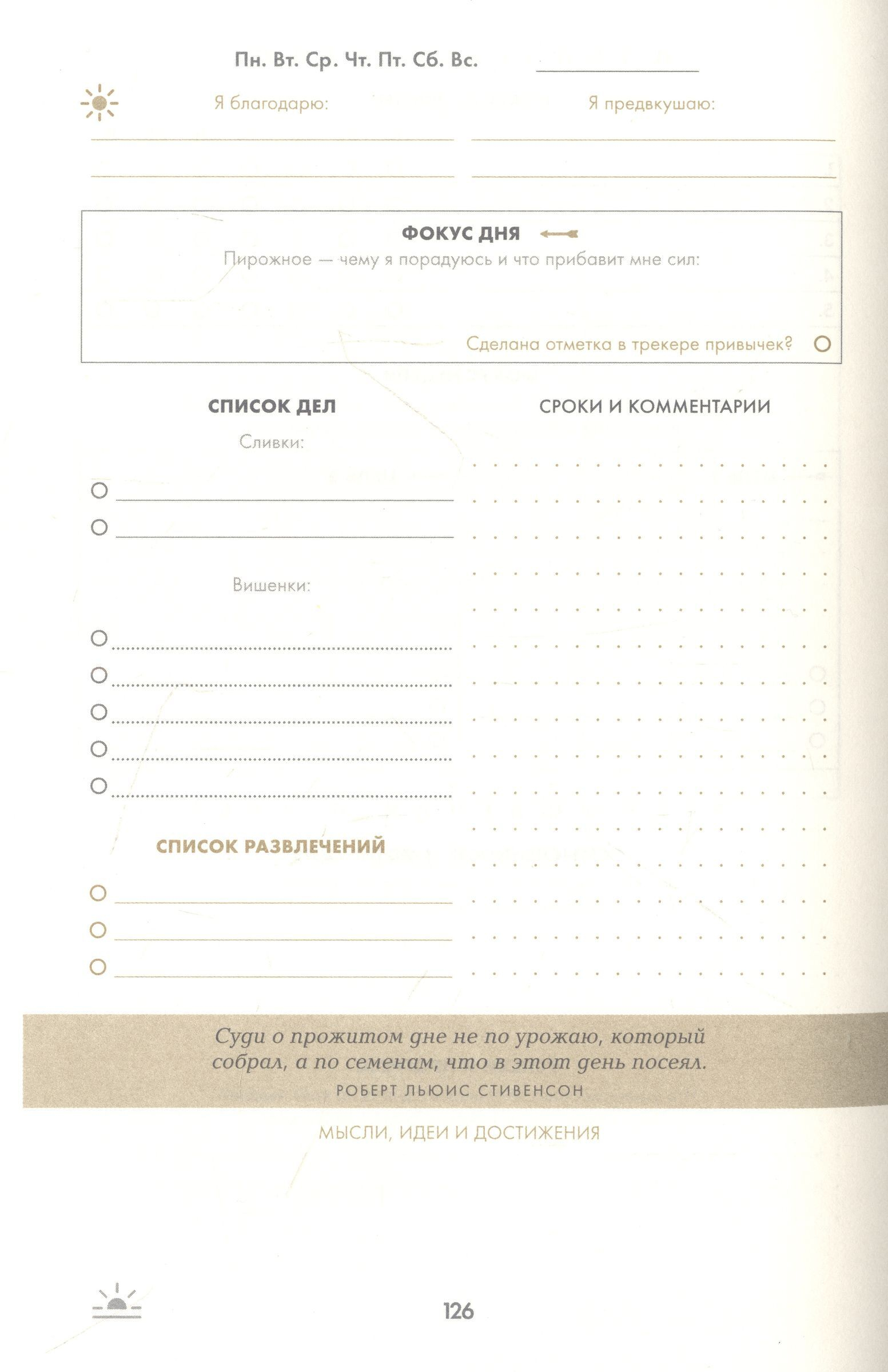 В основе концепции «6 минут. Дневник успеха» — ваше собственное определение успеха в профессиональной и личной жизни. Это может быть желание иметь больше денег, славы, любви, а возможно, спокойствия, независимости. Путь к успеху не менее индивидуален, чем его определение. Дневник поможет поставить цели, которые отвечают вашим личным желаниям и потребностям, а не чужим ожиданиям. Больше дел без усталости. Благодаря сочетанию практических упражнений по развитию осознанности и проверенных стратегий повышения продуктивности вы добиваетесь бóльших целей по-новому: не только последовательно, но и более спокойно.