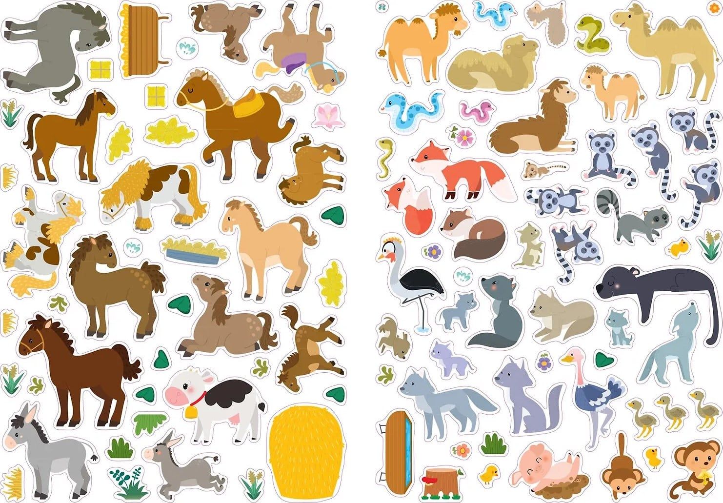 В ней вы найдёте 12 ярких тематических пейзажей-фонов с изображениями леса, фермы, пустыни, тропических джунглей, а также более 600 многоразовых наклеек, с помощью которых ребёнок сможет создать собственный мир, познакомиться с разными животными, растениями, весело и с пользой провести время.