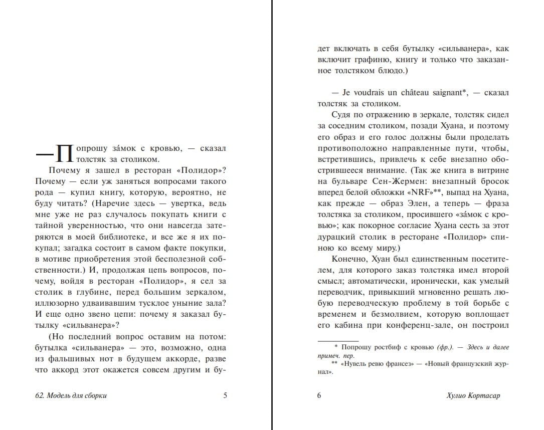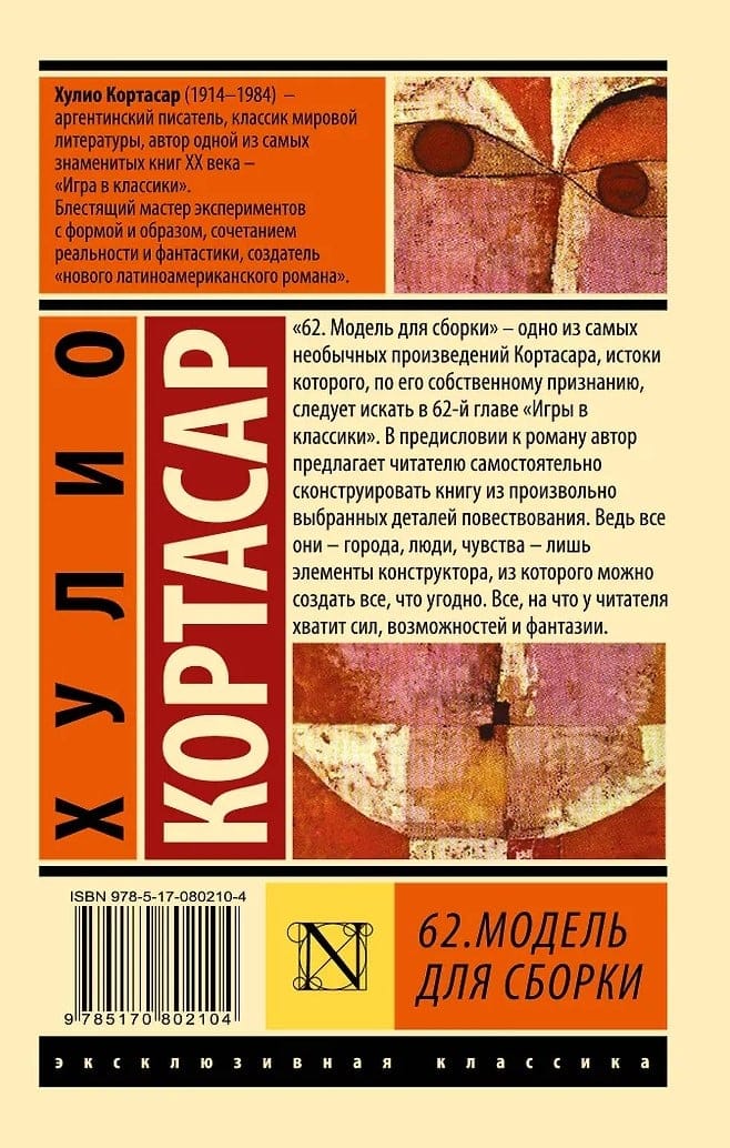 Хулио Кортасар (1914-1984) – аргентинский писатель, классик мировой литературы, автор одной из самых знаменитых книг ХХ века – «Игра в классики». . .Блестящий мастер экспериментов с формой и образом, сочетанием реальности и фантастики, создатель «нового латиноамериканского романа». . .«62. Модель для сборки» – одно из самых необычных произведений Кортасара, истоки которого, по его собственному признанию, следует искать в 62-й главе «Игры в классики». В предисловии к роману автор предлагает читателю самостоятельно сконструировать книгу из произвольно выбранных деталей повествования. Ведь все они – города, люди, чувства – лишь элементы конструктора, из которого можно создать все что угодно. Все, на что у читателя хватит сил, возможностей и фантазии.