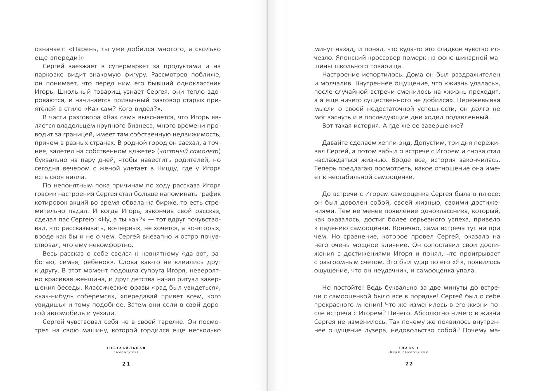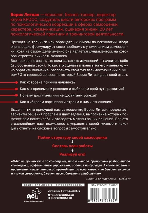 Приходя на тренинги или обращаясь к книгам по психологии, люди очень редко формулируют свою проблему с упоминанием самооценки. Хотя на самом деле именно она является фундаментом, на котором строится личность человека. Все прекрасно знают, что если вы хотите изменений - начните с себя (и с осознания себя). Но как это сделать и понять, на что именно нужно обратить внимание, распознать свой тип взаимоотношений с миром? Это хороший вопрос, на который в книге «7 шагов к стабильной самооценке» Борис Литвак дает свой ответ. - Как устроена психика человека? - Как мы принимаем решения и выбираем свой путь развития? - Почему достигаем или не достигаем успеха? - Как выбираем партнеров и строим с ними отношения? Выделяя типы присущей нам самооценки, Борис Литвак предлагает варианты решения проблем и дает задания, выполнение которых поможет вам понять себя и отследить мотивы ваших решений. Все это в дальнейшем даст возможность управлять своей жизнью и находить ответы на сложные вопросы самостоятельно. Пойми структуру своей самооценки → Составь план работы → Реализуй его.