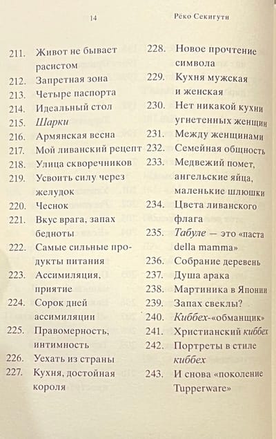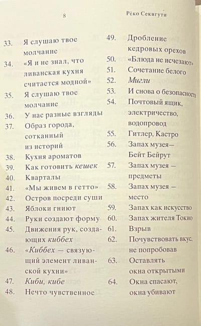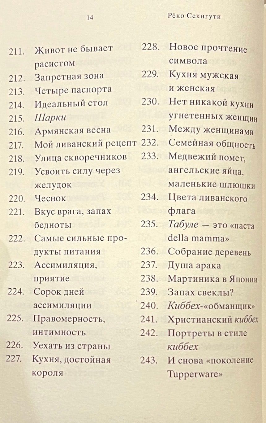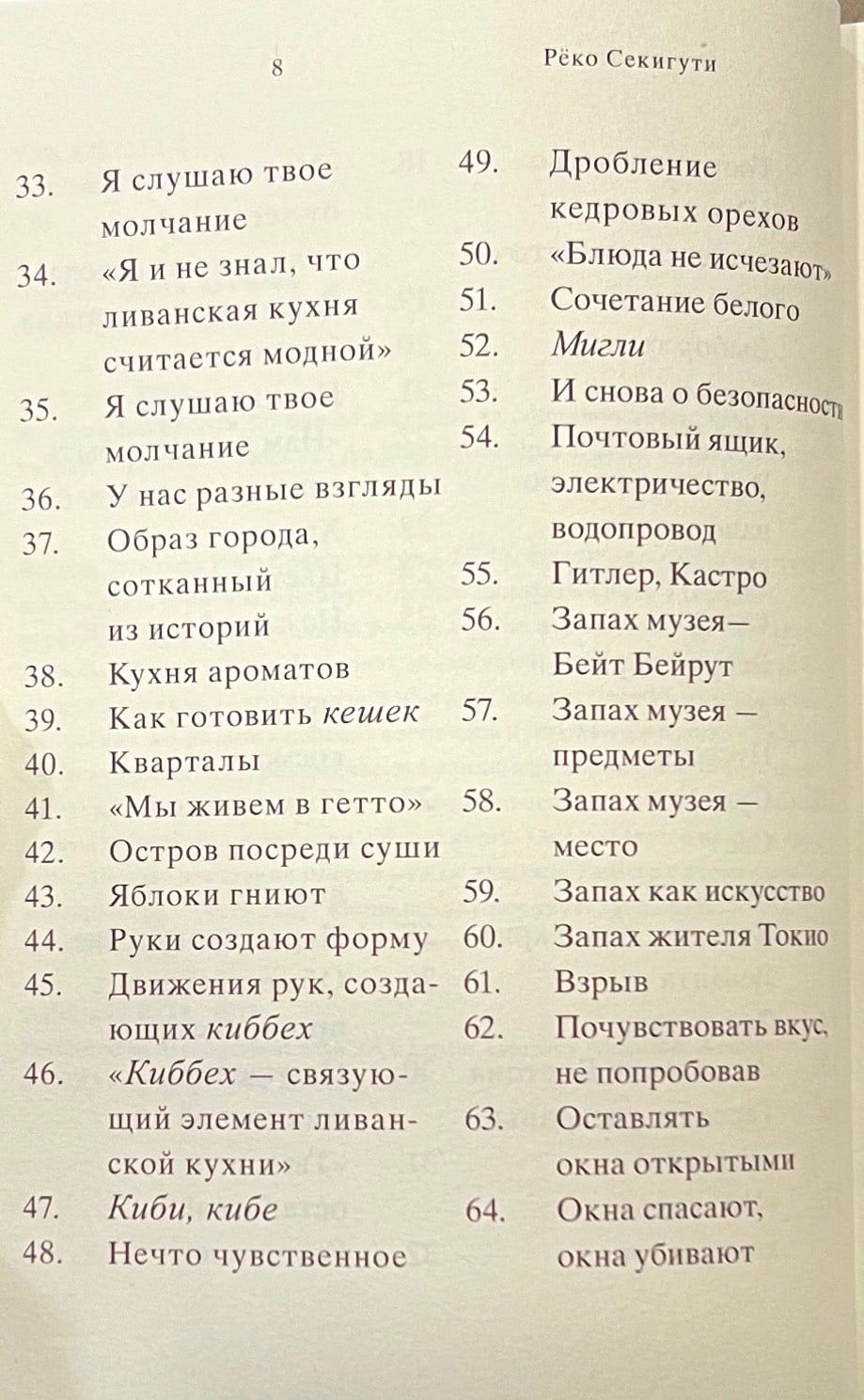 Ее «кулинарная хроника» — это лирический травелог, состоящий из множества микроглав, по-разному перекликающихся с блюдами и вкусами Бейрута. Секигути рисует гастрономический ландшафт города, вспоминая свои встречи и открытия, сделанные во время этого путешествия, рассказы ливанцев о войне, ностальгии и революции.