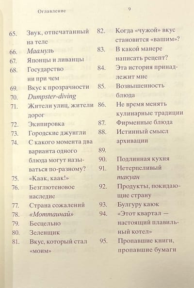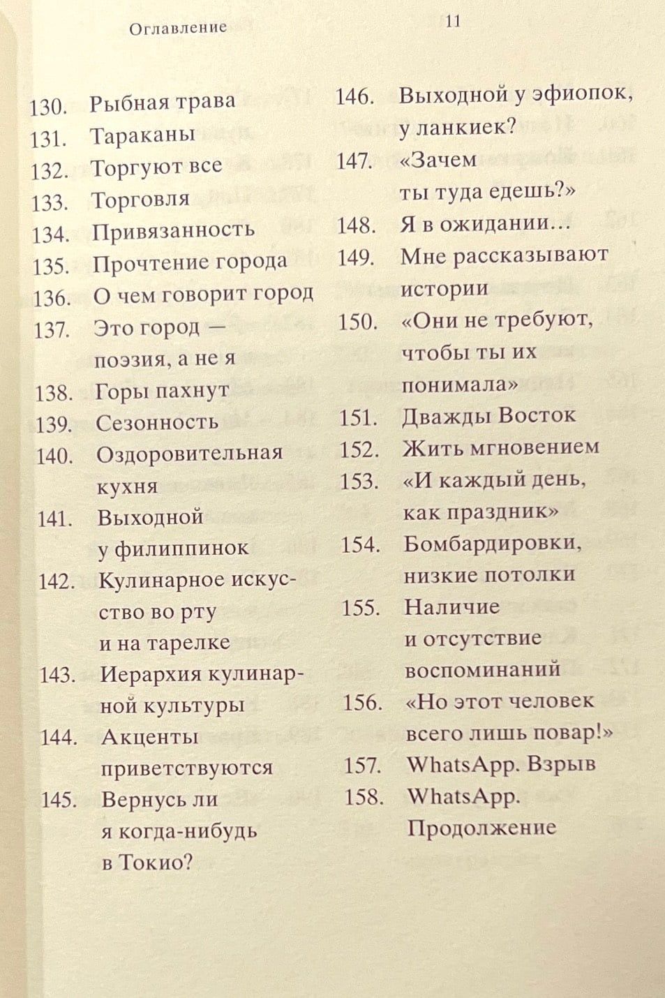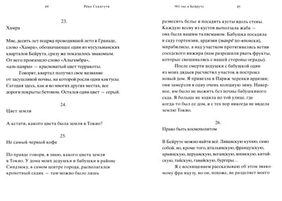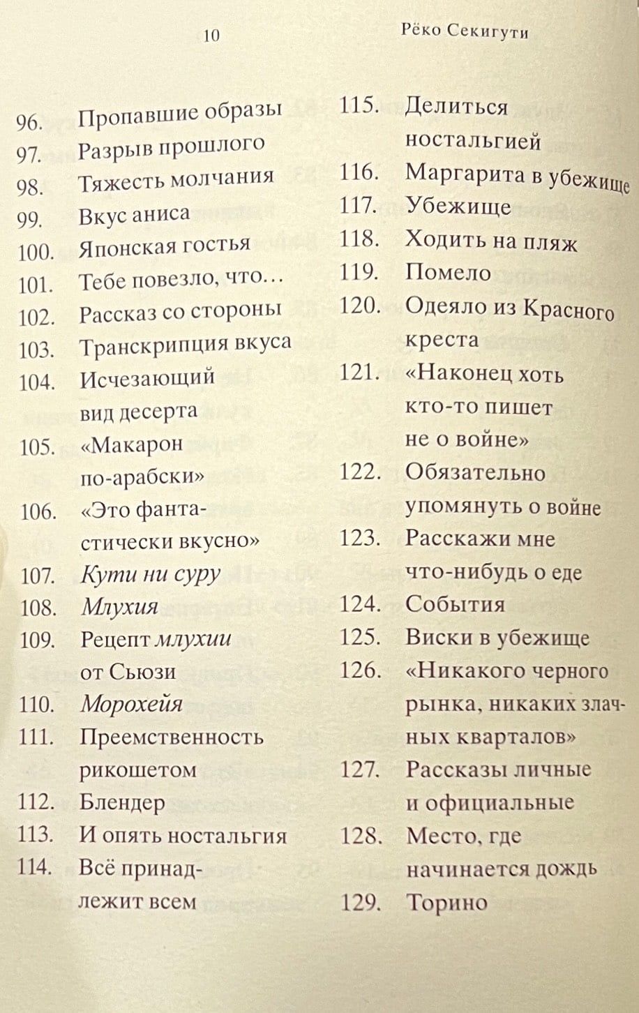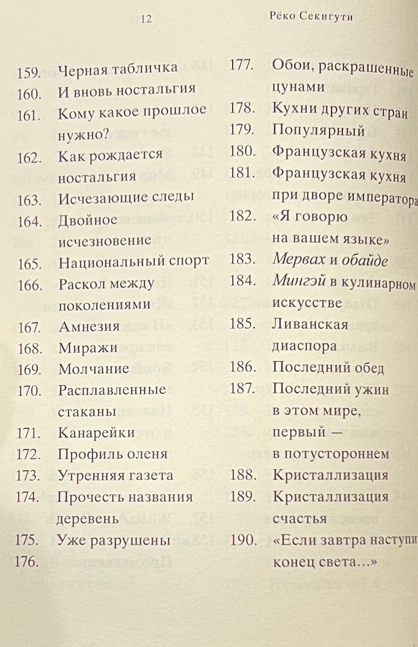 Ее «кулинарная хроника» — это лирический травелог, состоящий из множества микроглав, по-разному перекликающихся с блюдами и вкусами Бейрута. Секигути рисует гастрономический ландшафт города, вспоминая свои встречи и открытия, сделанные во время этого путешествия, рассказы ливанцев о войне, ностальгии и революции.