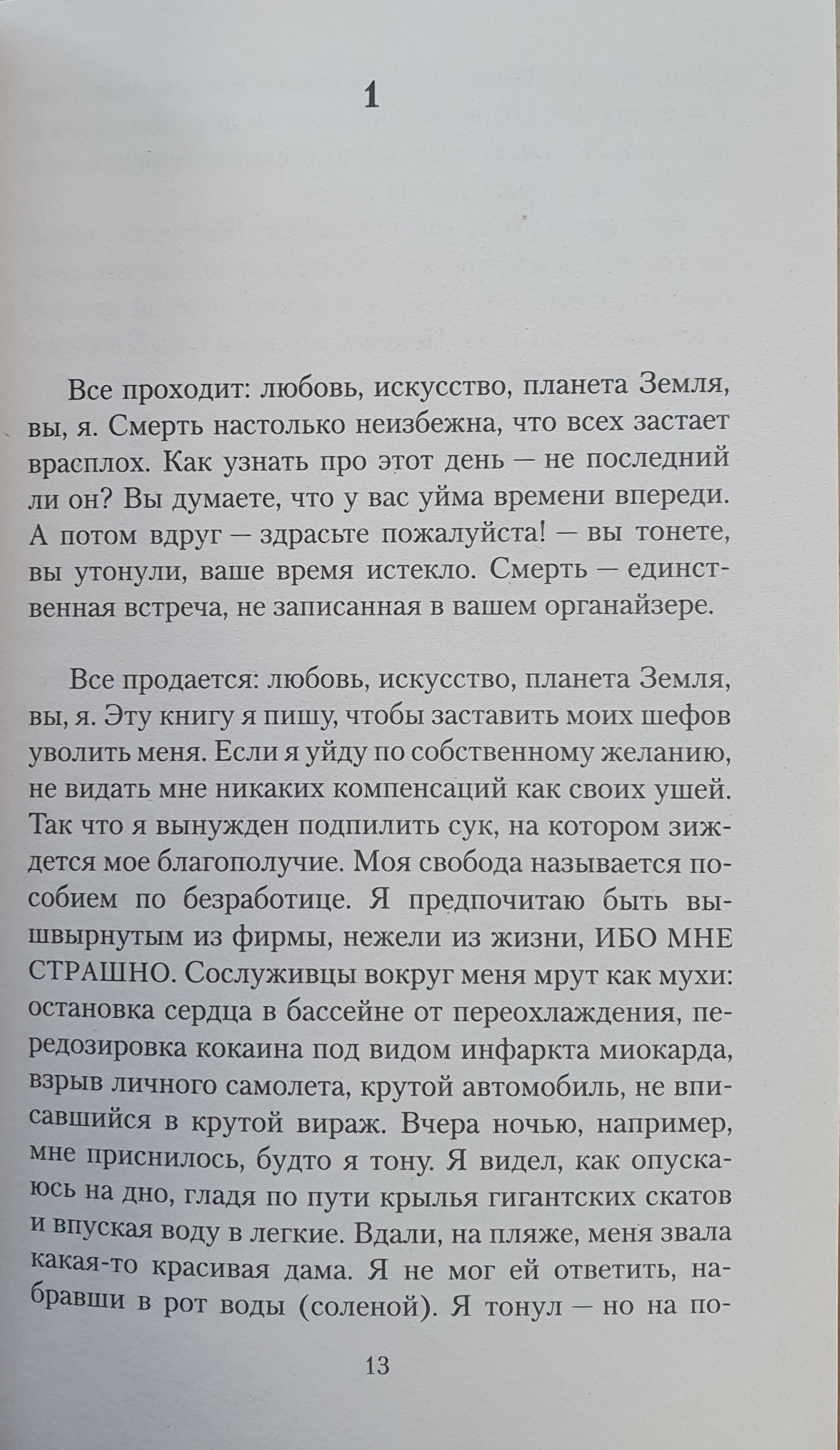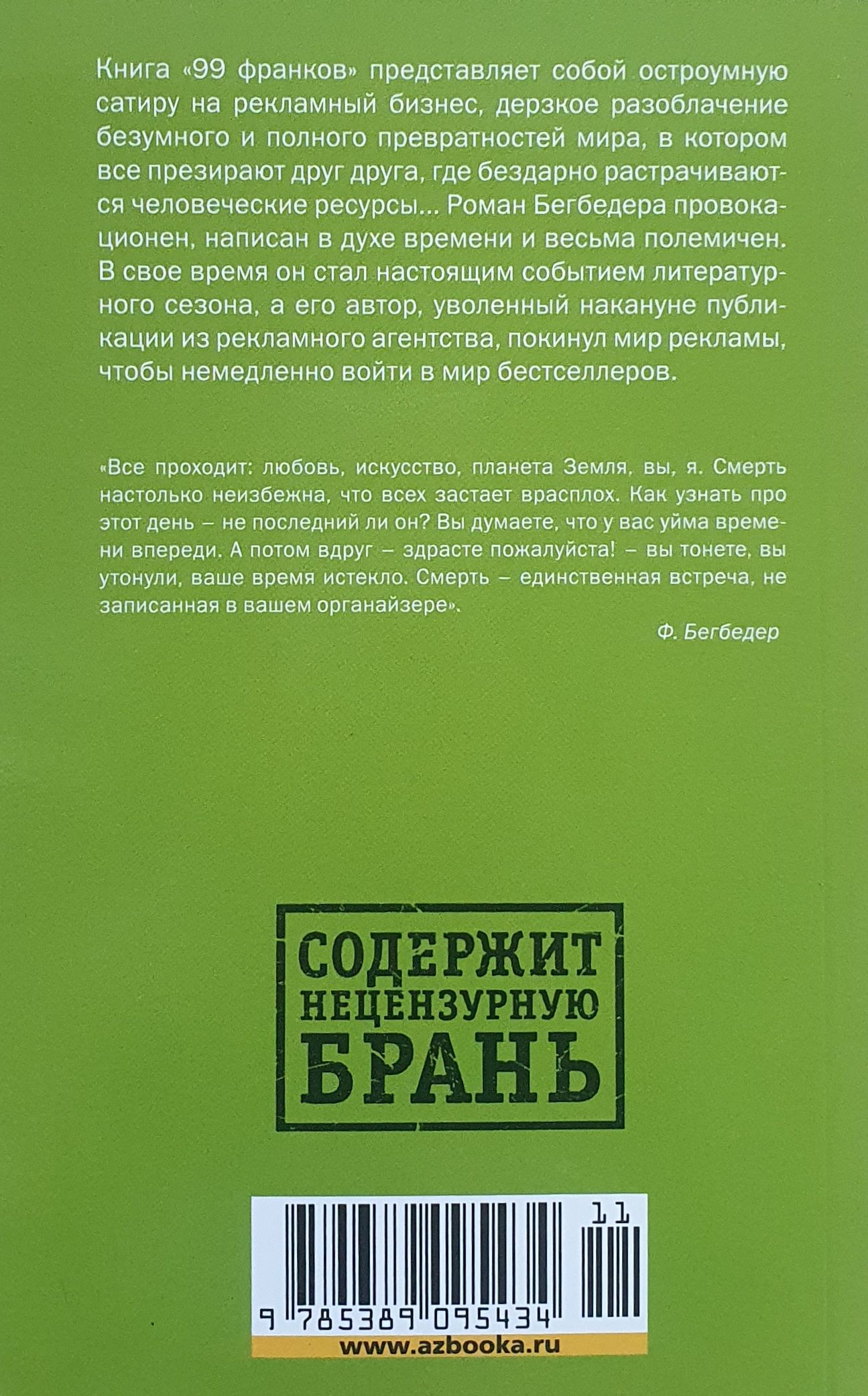 Книга «99 франков» представляет собой остроумную сатиру на рекламный бизнес, дерзкое разоблачение безумного и полного превратностей мира, в котором все презирают друг друга, где бездарно растрачиваются человеческие ресурсы… Роман Бегбедера провокационен, написан в духе времени и весьма полемичен. В свое время он стал настоящим событием литературного сезона, а его автор, уволенный накануне публикации из рекламного агентства, покинул мир рекламы, чтобы немедленно войти в мир бестселлеров.