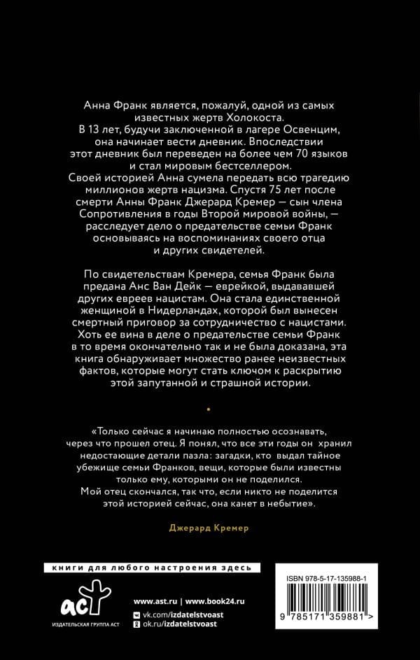 Анна Франк является, пожалуй, одной из самых известных жертв Холокоста. В 13 лет она начала вести дневник, который впоследствии стал мировым бестселлером и был переведен на более чем 70 языков. Своей историей Анна сумела передать всю трагедию миллионов жертв нацизма. Спустя 75 лет после смерти Анны Франк, Джерард Кремер — сын члена Сопротивления в годы Второй мировой войны, — расследует дело о предательстве семьи Франк, основываясь на воспоминаниях своего отца и других свидетелей. По свидетельствам Кремера, семья Франк была предана Анс Ван Дейк — еврейкой, выдававшей других евреев нацистам. Она стала единственной женщиной в Нидерландах, которой был вынесен смертный приговор за сотрудничество с нацистами. Хоть ее вина в деле о предательстве семьи Франк в то время окончательно так и не была доказана, эта книга обнаруживает множество ранее неизвестных фактов, которые могут стать ключом к раскрытию этой запутанной и страшной истории.