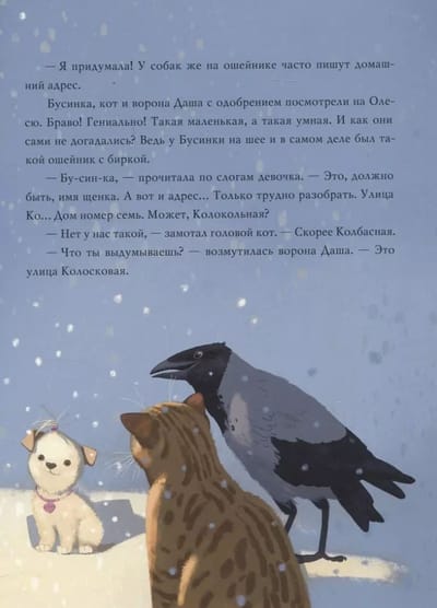 А снег всё шёл и шёл… И собачка Бусинка всё никак не могла отыскать дом, где она жила со своим хозяином, с которым только что играла в прятки во дворе. В новом районе все высотки так похожи одна на другую. Как же найти свой дом? Ведь скоро Новый год! На помощь Бусинке приходят новые друзья — обыкновенный рыжий кот и ворона Даша.