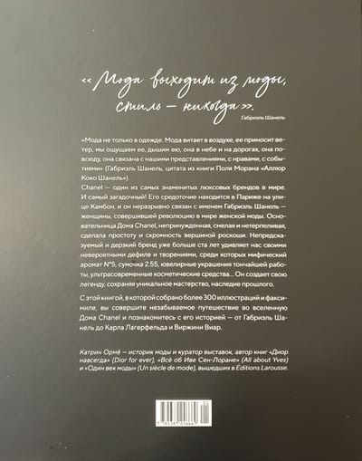 Непредсказуемый и дерзкий бренд уже больше ста лет удивляет нас своими невероятными дефиле и творениями, среди которых мифический аромат N°5, сумочка 2.55, ювелирные украшения тончайшей работы, ультрасовременные косметические средства… Он создает свою легенду, сохраняя уникальное мастерство, наследие прошлого. С этой книгой, в которой собрано более 300 иллюстраций и факсимиле, вы совершите незабываемое путешествие во вселенную Дома Chanel и познакомитесь с его историей — от Габриэль Шанель до Карла Лагерфельда и Виржини Виар.