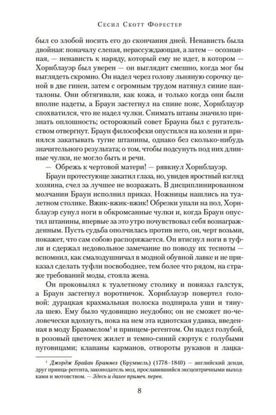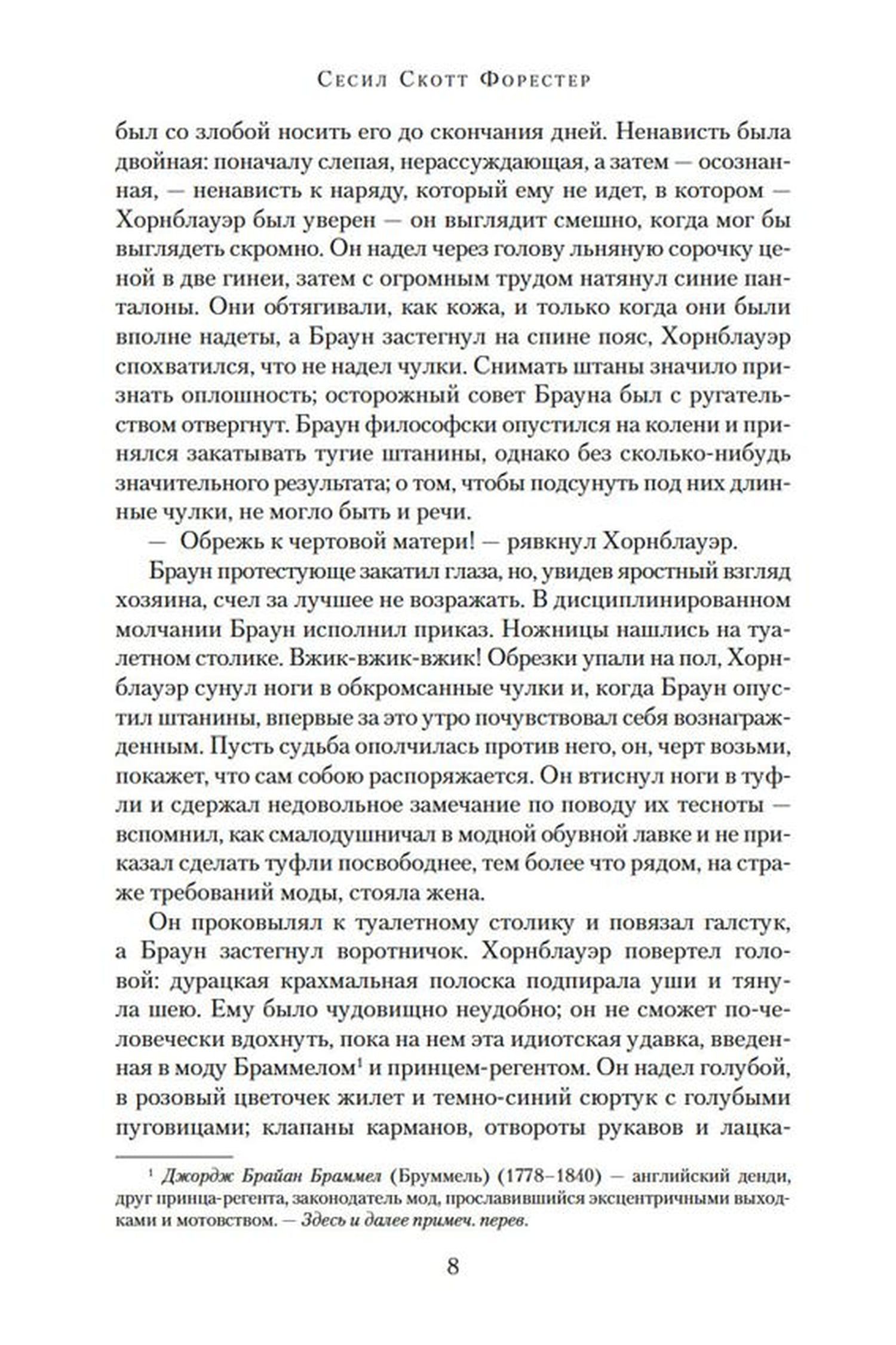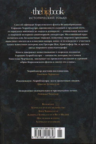 Сага об офицере королевского флота Великобритании Горацио Хорнблауэре, прошедшем славный и трудный путь от простого мичмана до лорда и адмирала, — уникальное явление в мировой историко-авантюрной литературе. Миллионный круг почитателей, бесконечные тиражи, поистине мировое признание, выведшее писателя в классики жанра, кино- и телеверсии с участием таких известных актеров, как Грегори Пек, Кристофер Ли, и других звезд мирового кинематографа. Автор саги, Сесил Скотт Форестер, говорил о своем герое: «Он доставил мне бесчисленных друзей по всему миру. Таможенники читают мою фамилию и пропускают мой багаж, не досматривая. Он свел меня с адмиралами и принцессами, и я благодарен ему, честное слово, хотя и думаю часто, что лучше б ему этого не делать». Не каждому писателю настолько повезло с персонажем. Сага о Горацио Хорнблауэре оставила заметный литературный след. Книжный сериал Бернарда Корнуэлла о стрелке Шарпе создавался под влиянием Форестера. Патрик О’Брайен, отталкиваясь от книг знаменитой саги, написал многотомную эпопею о капитане Обри. Даже Гарри Гаррисон спародировал по-доброму образ героя Форестера в одном из своих рассказов («Капитан Гонарио Харпплейер»). Книга завершает повествование о морских подвигах Горацио Хорнблауэра — личности, которая, по словам Уинстона Черчилля, «вызывает из прошлого великий и суровый образ королевского флота в эпоху его славы».