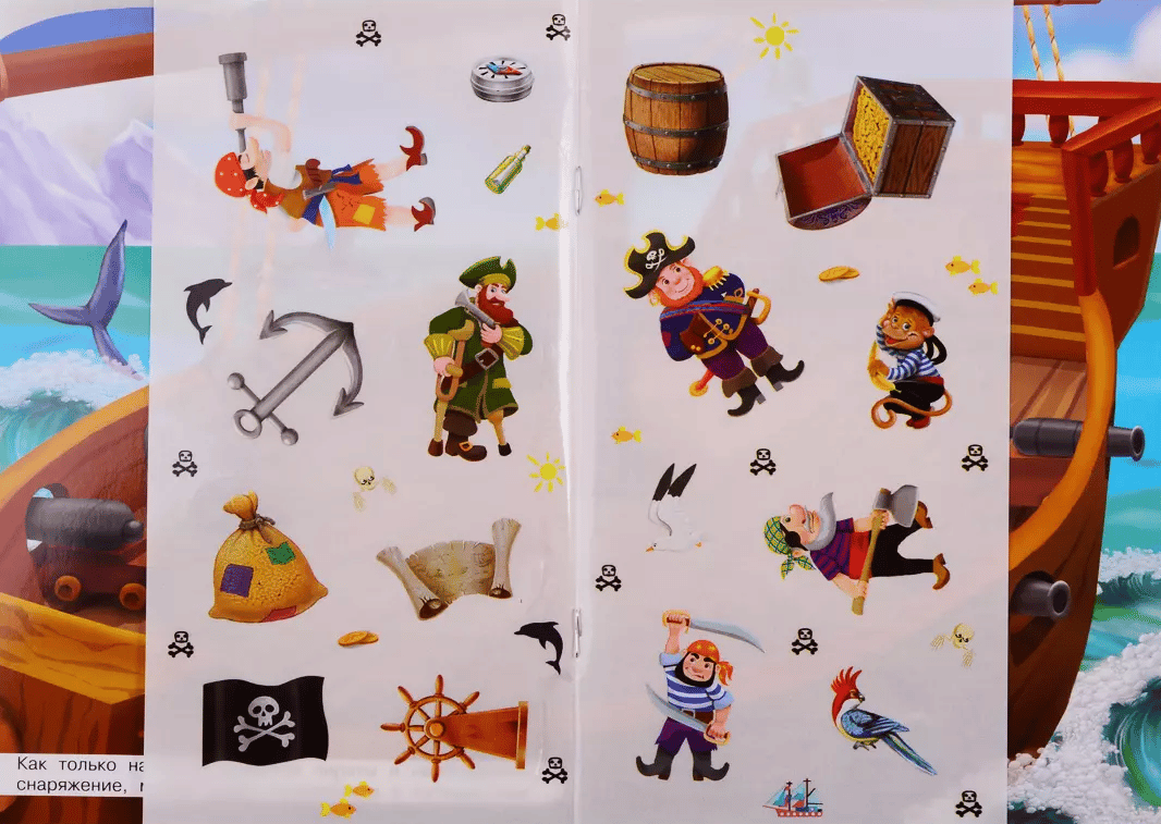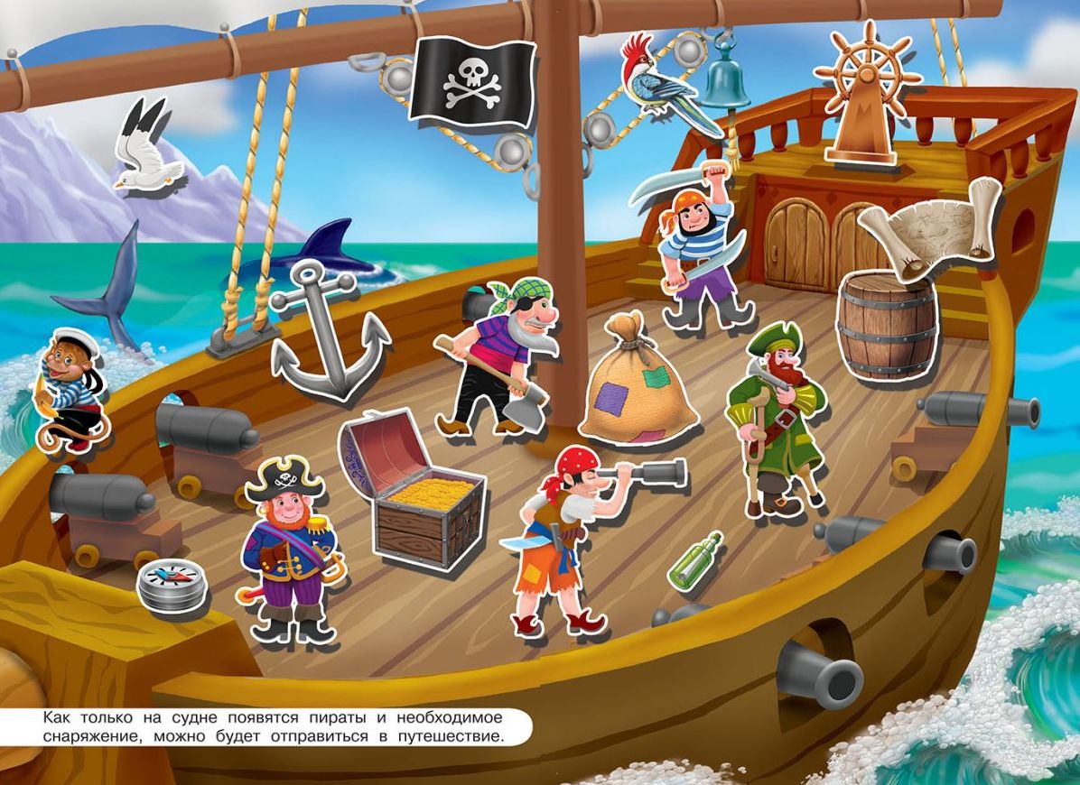 Яркая и привлекательная книжка напечатана на плотной высококачественной мелованной бумаге. На книжном развороте издания нарисована панорама палубы средневекового парусного корабля, а специальная вставка содержит красочные многоразовые наклейки с изображениями команды пиратов и различных видов корабельного снаряжения.