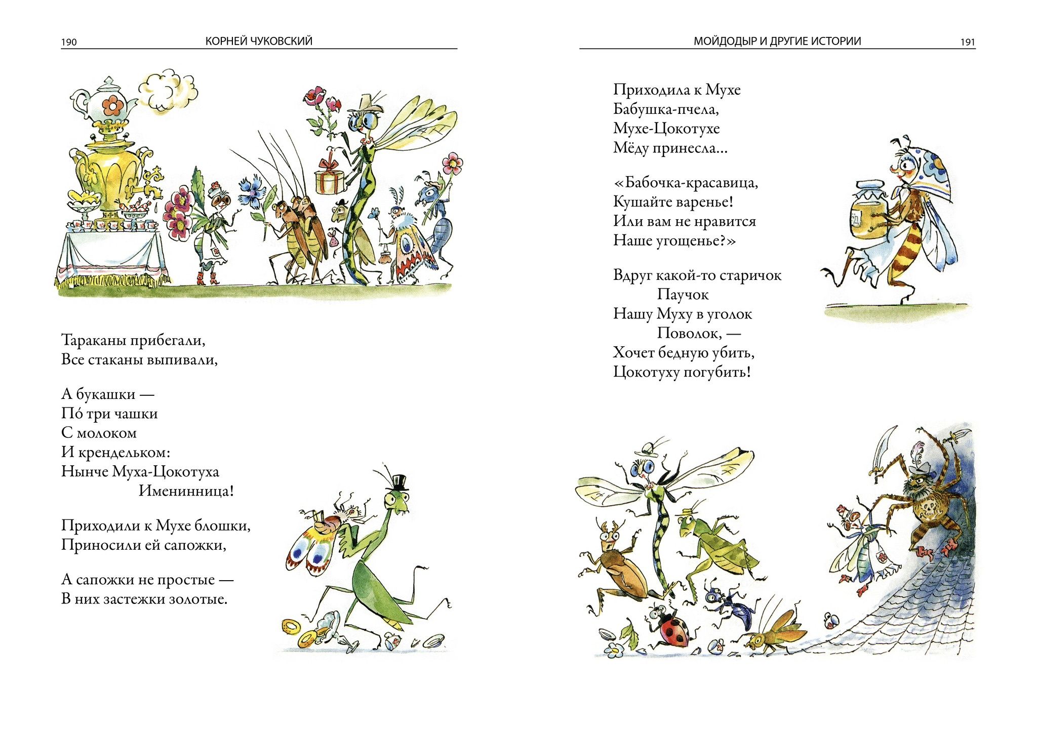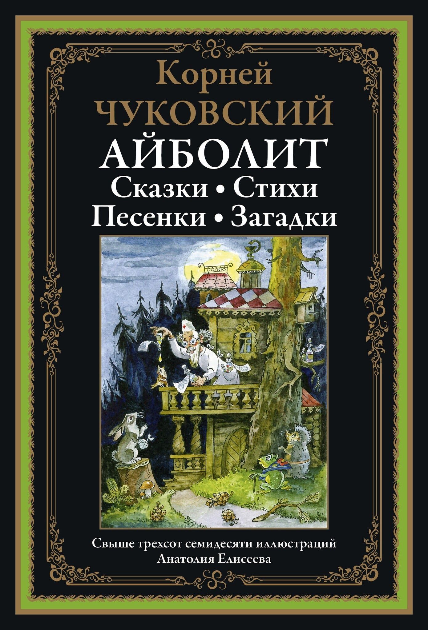 Сборник включает ставшие классикой стихи, повести и рассказы для детей Корнея Ивановича Чуковского; среди них «Доктор Айболит», «Мойдодыр», «Чудо-дерево», «Приключения Бибигона», «Муха Цокотуха», «Телефон», «Федорино горе», «Тараканище», «Краденое солнце», «Английские народные песенки», 25 загадок и отгадок, а также другие произведения писателя. Все иллюстрации в книге выполнены талантливым рисовальщиком и народным художником Российской Федерации Анатолием Михайловичем Елисеевым. Чуковский знаменит прежде всего как автор стихов, знакомых нам с детства. Кто не слышал, к примеру, его «Тараканища» или «Мухи Цокотухи»? Менее известен Корней Иванович широкой публике как блестящий историк литературы. Вдумчивое чтение книг было главной страстью его жизни. Свое детство Николай Корнейчуков провел в Одессе, его матерью была простая крестьянка. Юношу, отчисленного из гимназии за «низкое происхождение», неудержимо тянуло к литературе. Он мог, вышагивая по улицам Одессы, начать громогласно и с большим чувством читать строфы из «Евгения Онегина» или Фета. Под псевдонимом Корней Чуковский он начал писать статьи для газеты «Одесские новости». Вскоре редакция послала Чуковского корреспондентом в Лондон, ведь он блестяще владел английским, который выучил самостоятельно. Там, в читальном зале Британского музея, начинающий литератор жадно глотал тома Свифта, Теккерея и десятков других англоязычных писателей. Вернувшись в Россию, Чуковский вскоре осел в финском местечке Куоккала, где занялся переводами и литературной критикой, быстро собрав огромную библиотеку. Из-под его пера выходили блестящие очерки о творчестве Чехова, Бальмонта, Блока, Куприна. Чуковский написал капитальную монографию о творчестве Некрасова (в 1962 г. он был удостоен за нее Ленинской премии). Заниматься детскими стихами Корней Иванович начал, уже снискав себе славу талантливого литератора. При этом он выработал свой неповторимый стиль, «корнееву строфу». Стихи других поэтов Чуковский читал блестяще и был в курсе всех поэтических новинок страны. Порой хорошо всем нам знакомые детские стихи заслоняют иное литературное творчество Чуковского, но это говорит лишь о многогранности этого удивительного человека. Особый шарм книге придают веселые иллюстрации, выполненные талантливым художником Анатолием Михайловичем Елисеевым. Свой трудовой путь он начал в качестве актера, уже в четырнадцать лет стал сниматься в кино. Однако истинным его призванием было рисование; Елисеев это остро чувствовал. Тяга к живописи привела его в Московский полиграфический институт, который он закончил в 1952 г. Тогда Елисееву было двадцать два года. Молодой человек вплотную занялся карикатурой и книжными иллюстрациями, начал сотрудничать с журналами «Крокодил», «Веселые картинки» и «Мурзилка»; на их страницах его веселые озорные рисунки узнавались мгновенно. В 1966 г. Елисеев стал заслуженным художником РСФСР, а в 2001 г. был удостоен звания «Народный художник Российской Федерации».