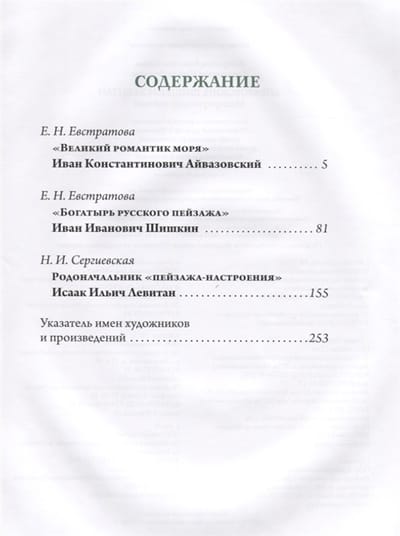 Книга рассказывает о жизни и творчестве трех ярчайших мастеров русского пейзажа - "великого романтика моря" Ивана Айвазовского, воспевшего красоту и мощь морской стихии; "богатыря русского пейзажа" Ивана Шишкина, сложившего в своем творчестве торжественный гимн родной природе; родоначальника "пейзажа-настроения" Исаака Левитана, создавшего самые поэтичные образы русского пейзажа.