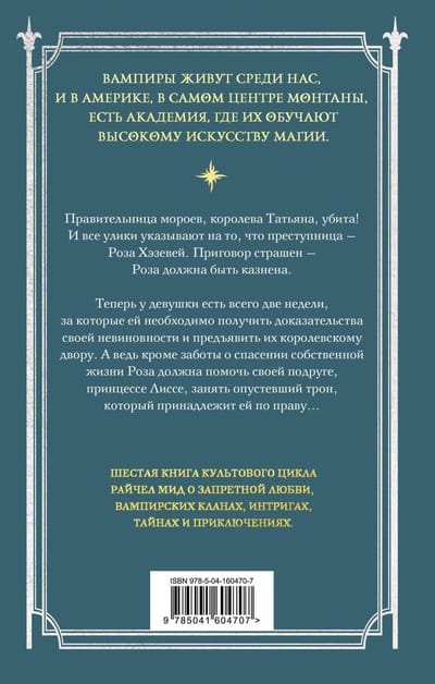 В сообществе вампиров произошло событие небывалое - убита правительница мороев королева Татьяна. И так сложилось, что все улики указывают на то, что преступница - Роза Хэзевей, выпускница Академии вампиров, недавно получившая звание стража. Приговор страшен - Роза должна быть казнена. У девушки есть всего две недели, за которые ей необходимо получить доказательства своей невиновности и предъявить их королевскому двору. Дело осложняется тем, что кроме заботы о спасении собственной жизни Роза должна помочь своей подруге, принцессе Лиссе, занять опустевший трон, который принадлежит ей по праву. Впервые на русском! Новая книга культового сериала об Академии вампиров! В сообществе вампиров произошло событие небывалое - убита правительница мороев королева Татьяна. И так сложилось, что все улики указывают на то, что преступница - Роза Хэзевей, выпускница Академии вампиров, недавно получившая звание стража. Приговор страшен - Роза должна быть казнена. У девушки есть всего две недели, за которые ей необходимо получить доказательства своей невиновности и предъявить их королевскому двору. Дело осложняется тем, что кроме заботы о спасении собственной жизни Роза должна помочь своей подруге, принцессе Лиссе, занять опустевший трон, который принадлежит ей по праву.