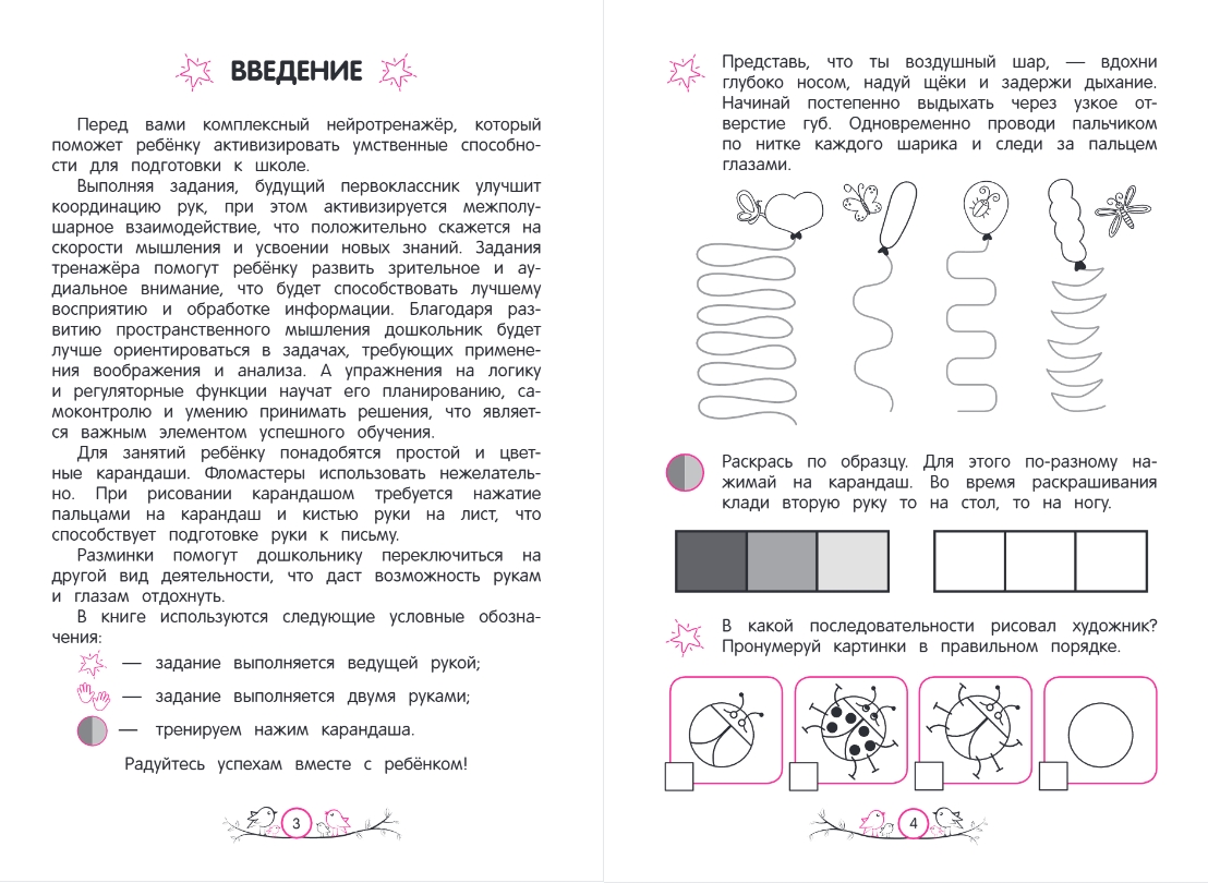 Занимаясь, ребёнок будет рисовать по точкам и обводить линии двумя руками одновременно, выполнять логические задания на ассоциации и на память, искать лишнее, дорисовывать по условию, находить спрятанные на картинке предметы, подбирать подходящие силуэты, заполнять логические квадраты, определять закономерности и продолжать последовательности.