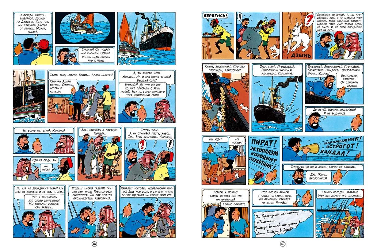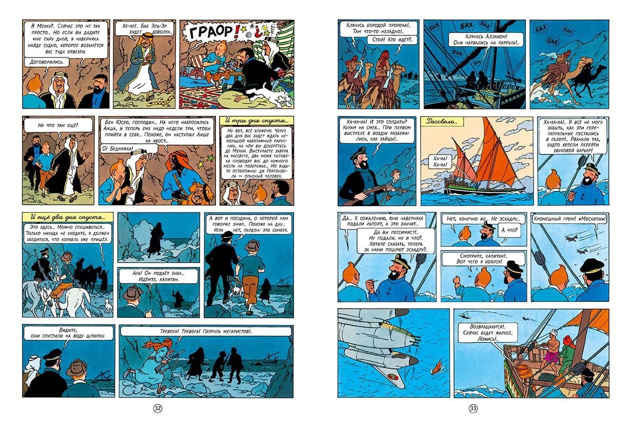 В Хемеде переворот. Тинтин и капитан Хаддок летят туда, чтобы помочь законному правителю эмиру Бен Калиш-Эзабу вернуть власть. Однако об их прибытии уже известно: в аэропорту Вад-эд-Дахра наших героев сажают в самолёт и отправляют обратно. Вскоре после взлёта на борту загорается двигатель, но пилот всё же умудряется совершить посадку на берегу Красного моря. В довершение всего в покинутом пассажирами самолёте происходит взрыв! Понимая, что всё это неспроста, Тинтин предлагает тайком вернуться в Вад-эд-Дахр, и под утро друзья уже стучатся в дверь лавки сеньора Оливейры да Фигуэйры, который рассказывает им, где найти эмира. Герои пробираются в горы, встречаются с Бен Калиш-Эзабом и узнают от него шокирующие факты о тех, кто стоит за повстанцами. Тинтин намерен помешать их преступным планам…