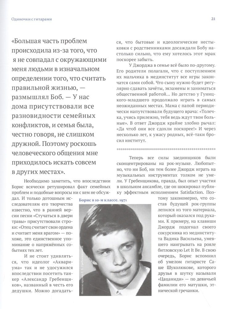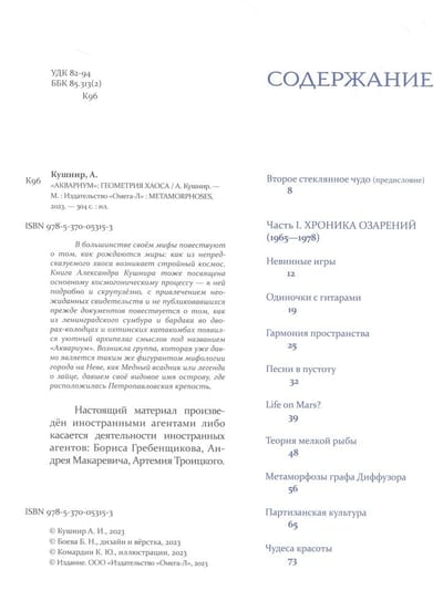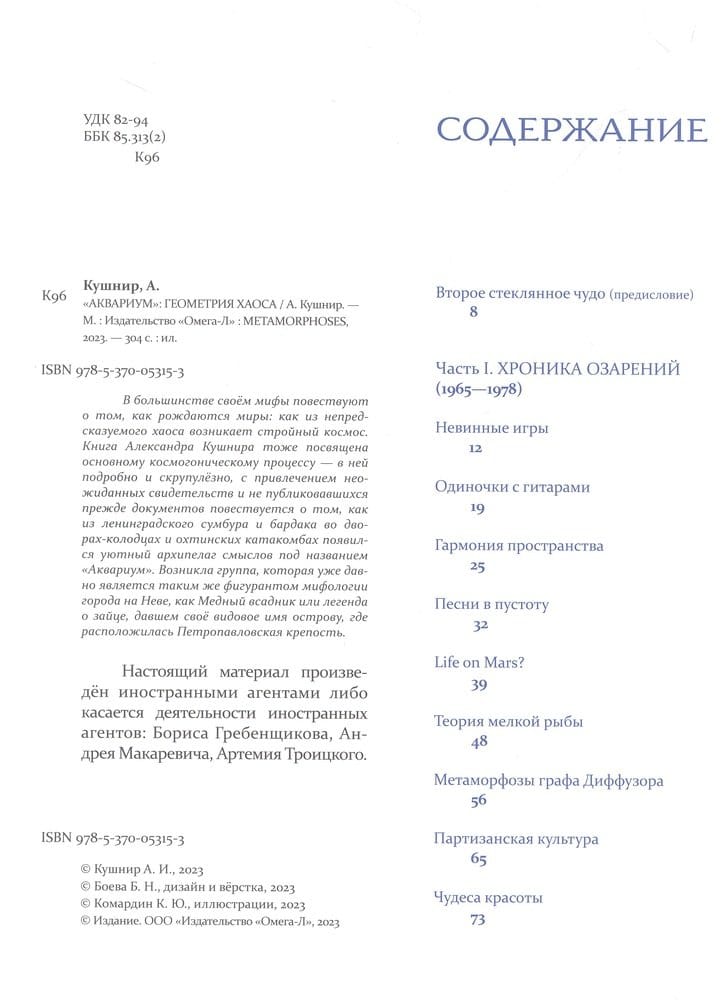 В большинстве своём мифы повествуют о том, как рождаются миры: как из непредсказуемого хаоса возникает стройный космос. Книга Александра Кушнира тоже посвящена основному космогоническому процессу — в ней подробно и скрупулёзно, с привлечением неожиданных свидетельств и не публиковавшихся прежде документов повествуется о том, как из ленинградского сумбура и бардака во дворах-колодцах и охтинских катакомбах появился уютный архипелаг смыслов под названием «Аквариум». Возникла группа, которая уже давно является таким же фигурантом мифологии города на Неве, как Медный всадник или легенда о зайце, давшем своё видовое имя острову, где расположилась Петропавловская крепость.