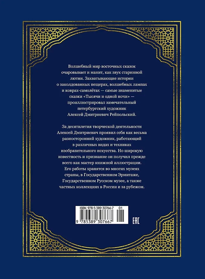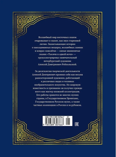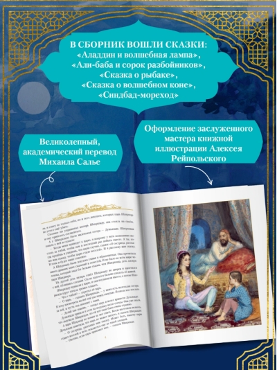 Волшебный мир восточных сказок очаровывает и манит, как звук старинной лютни. Захватывающие истории о заколдованных пещерах, волшебных лампах и коврах-самолётах — самые знаменитые сказки «Тысячи и одной ночи» — проиллюстрировал замечательный петербургский художник Алексей Дмитриевич Рейпольский.