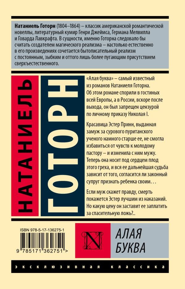 «‎Алая буква»‎ – самый известный из романов Натаниеля Готорна. Об этом романе спорили в гостиных всей Европы, а в России, вскоре после выхода, он был запрещен цензурой по личному приказу Николая I.