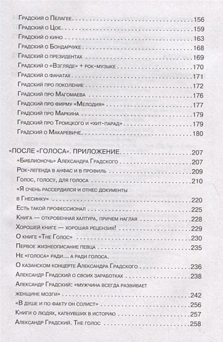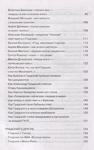 Выход книги приурочен к юбилею Александра Градского. Масштабы «‎родителя русского рок-н-ролла»‎ трудно переоценить, о чем бы ни шла речь: наставник, композитор, личность. Подтверждение тому можно найти в беседах и интервью, собранных в этом издании. Андрей Макаревич, Евгений Евтушенко, Александр Буйнов, Евгений Маргулис и другие, не менее известные нам персонажи, поведают о случаях, пересечениях, курьезах, о нем. А Градский, в свою очередь, о других, с присущей ему искрометностью.