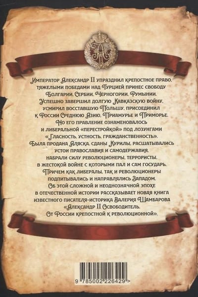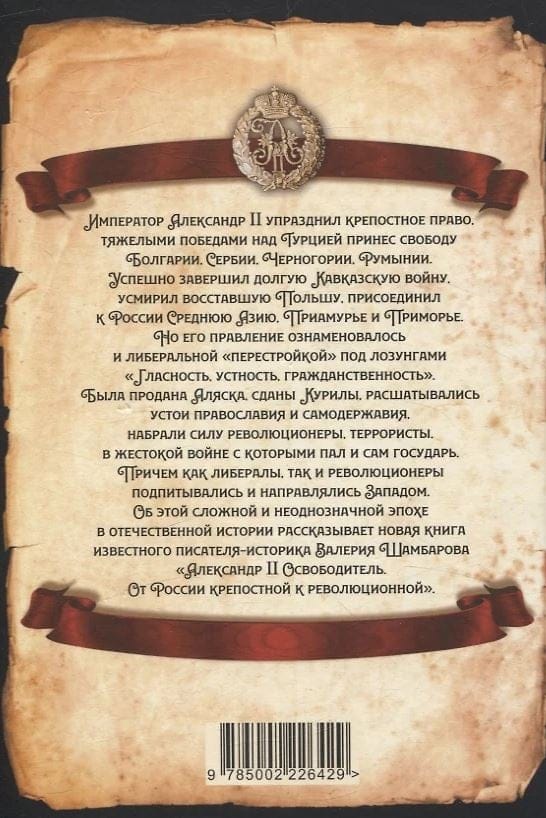 Император Александр II упразднил крепостное право, тяжелыми победами над Турцией принес свободу Болгарии, Сербии, Черногории, Румынии. Успешно завершил долгую Кавказскую войну, усмирил восставшую Польшу, присоединил к России Среднюю Азию, Приамурье и Приморье. Но его правление ознаменовалось и либеральной «перестройкой» под лозунгами «Гласность, устность, гражданственность». Была продана Аляска, сданы Курилы, расшатывались устои православия и самодержавия, набрали силу революционеры, террористы, в жестокой войне с которыми пал и сам государь. Причем как либералы, так и революционеры подпитывались и направлялись Западом. Об этой сложной и неоднозначной эпохе в отечественной истории рассказывает новая книга известного писателя-историка Валерия Шамбарова «Александр II Освободитель. От России крепостной к революционной».