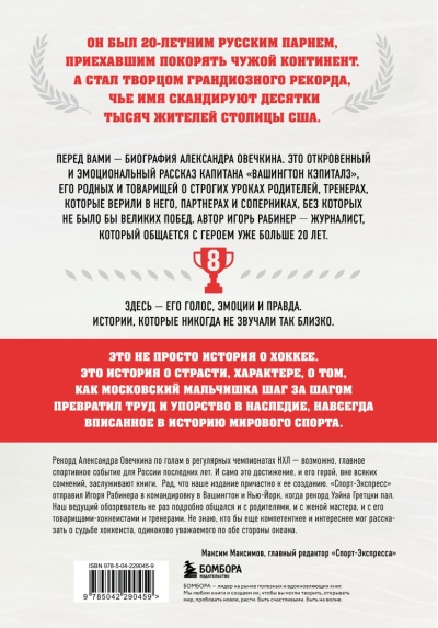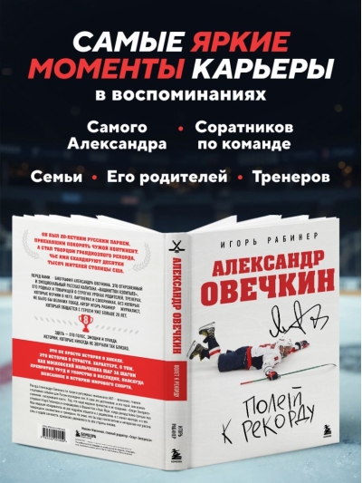 Перед вами — биография Александра Овечкина. Это откровенный и эмоциональный рассказ капитана «Вашингтон кэпиталз», его родных и товарищей о строгих уроках родителей, тренерах, которые верили в него, партнерах и соперниках, без которых не было бы великих побед. Автор, Игорь Рабинер,— журналист, который общается с героем уже больше 20 лет.